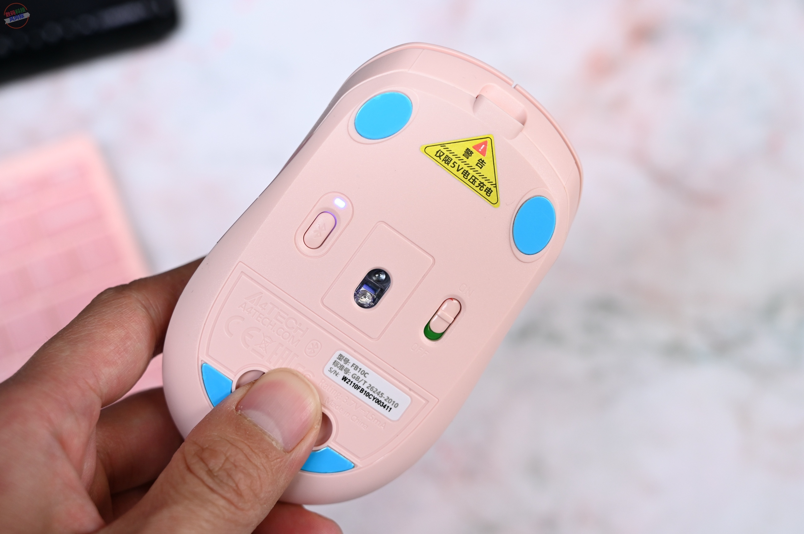 在鼠标底部,可以找到开关键以及蓝牙切换键,还有一个2.4G接收器收纳的位置。这款鼠标也采用了内置电池的设计,同样是通过USB-C型接口来进行充电,充满电后用几个月都没问题,所以平时可以放在包里备用,需要的时候拿出来就可以了。
