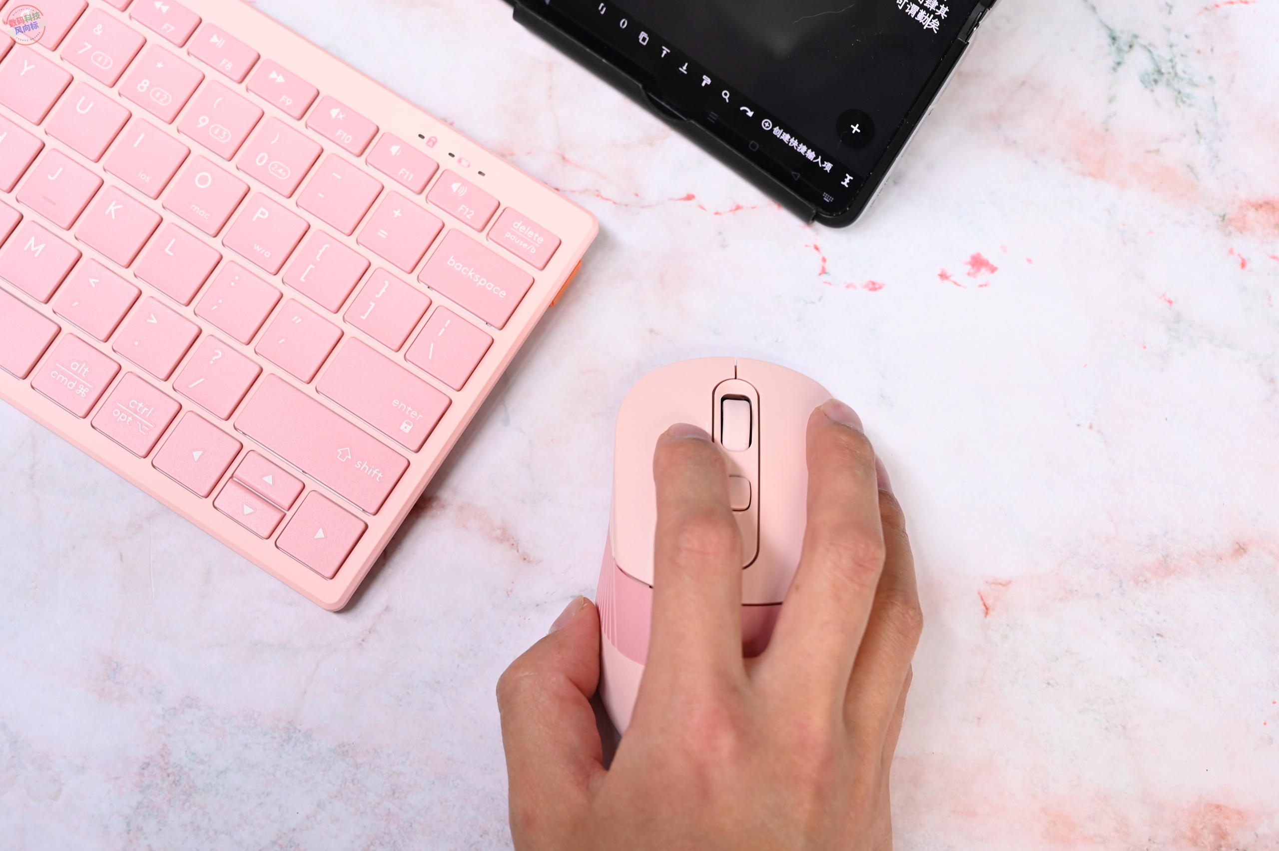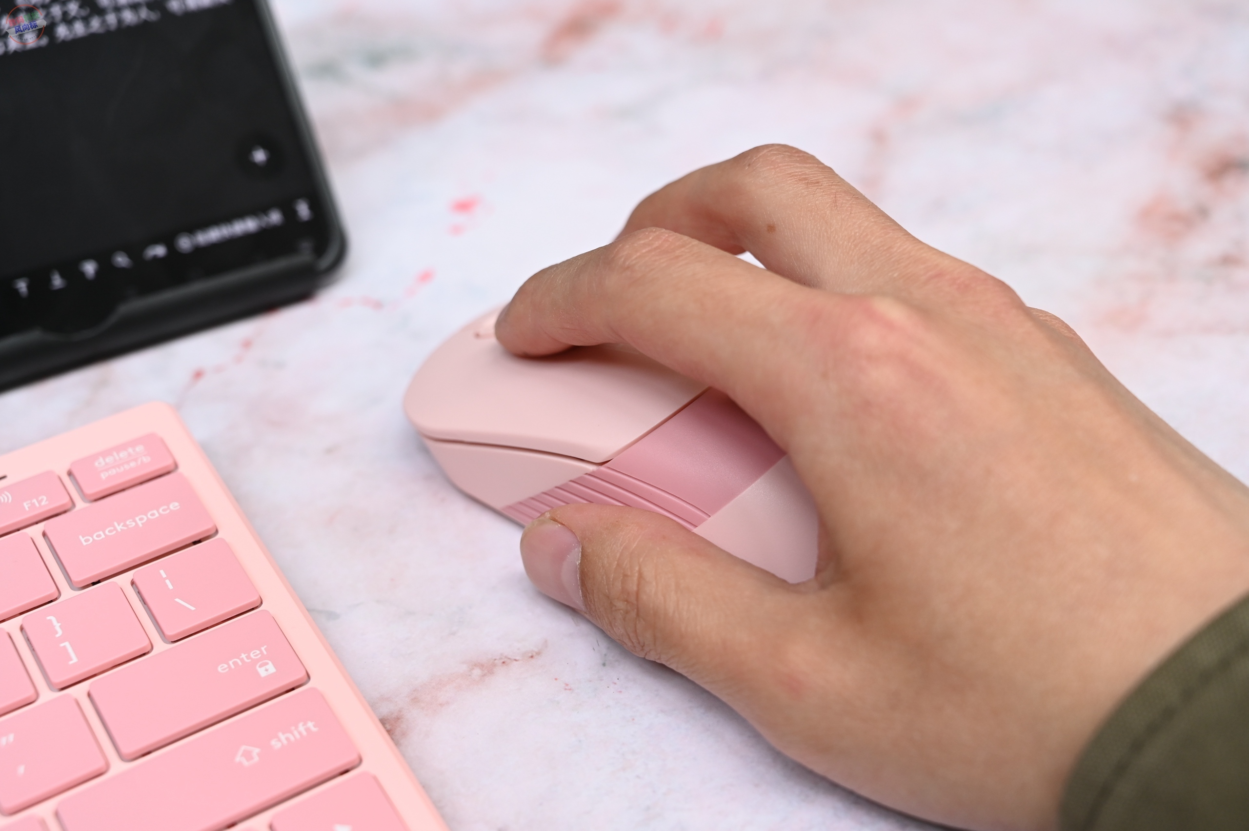 这款鼠标本身的设计很合理,而且手感不错,在它的侧裙区域有防滑设计,并且是加深的颜色,看起来很漂亮,这款鼠标的配色也很多,除了这款元气粉之外,还有石曜黑、象牙白、天幕蓝、抹茶绿等多种选择,整体配色和设计也都是非常时尚的。