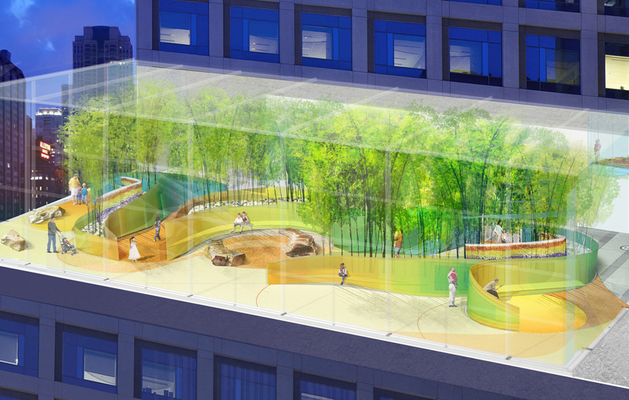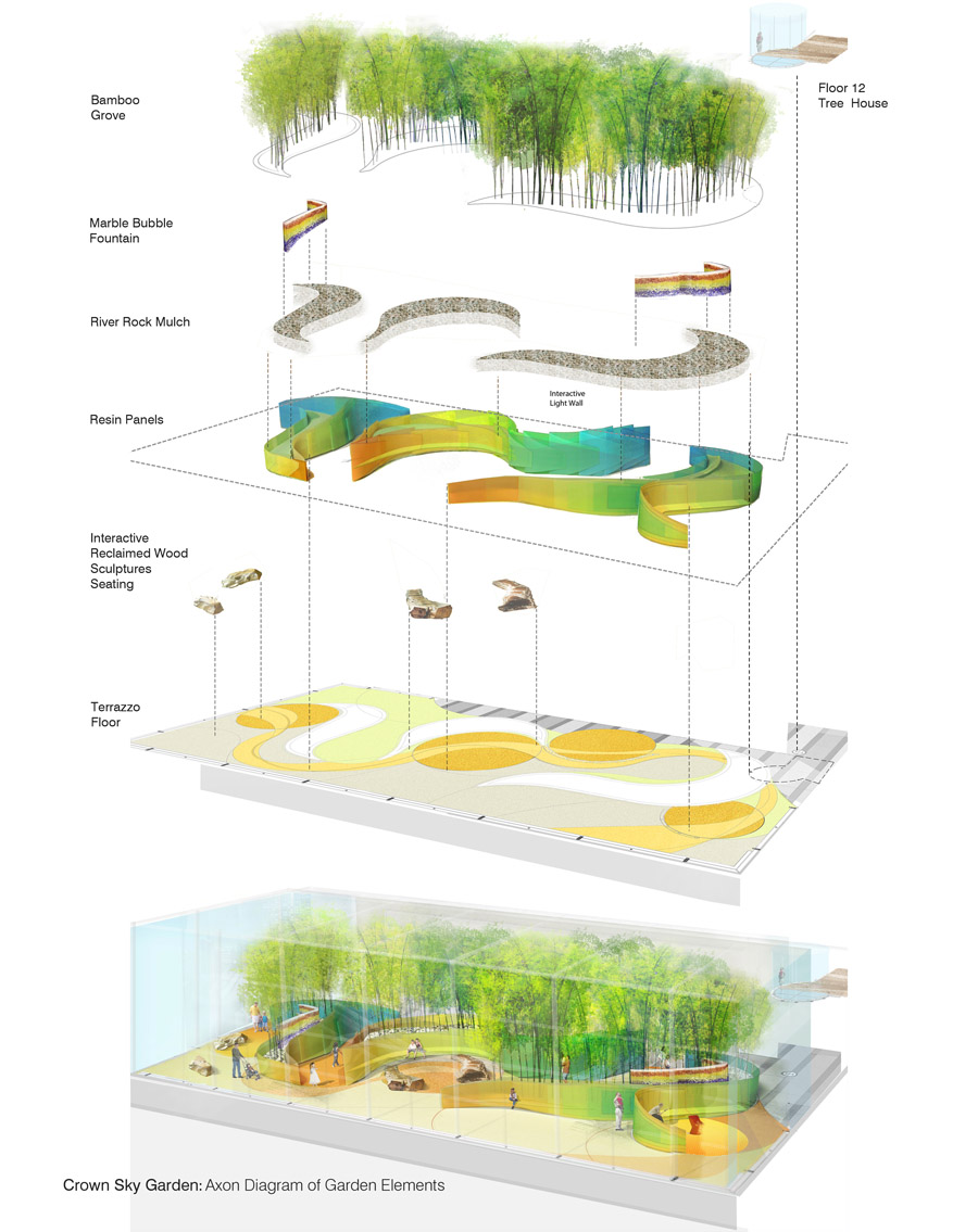 这个花园坐落在一个玻璃温室里面,由一系列光的互动元素、竹林、可回收的抗菌彩色树脂板、自然界的石头以及从当地回收来的木材来界定。曲折的竹林围着线状的玻璃珠喷泉,从地板到屋顶的玻璃窗都与芝加哥市中心的冥想风光毗邻,孩子们通过直接的接触参与来使这个花园充满活力,通过温室空间来演奏大自然的声音。