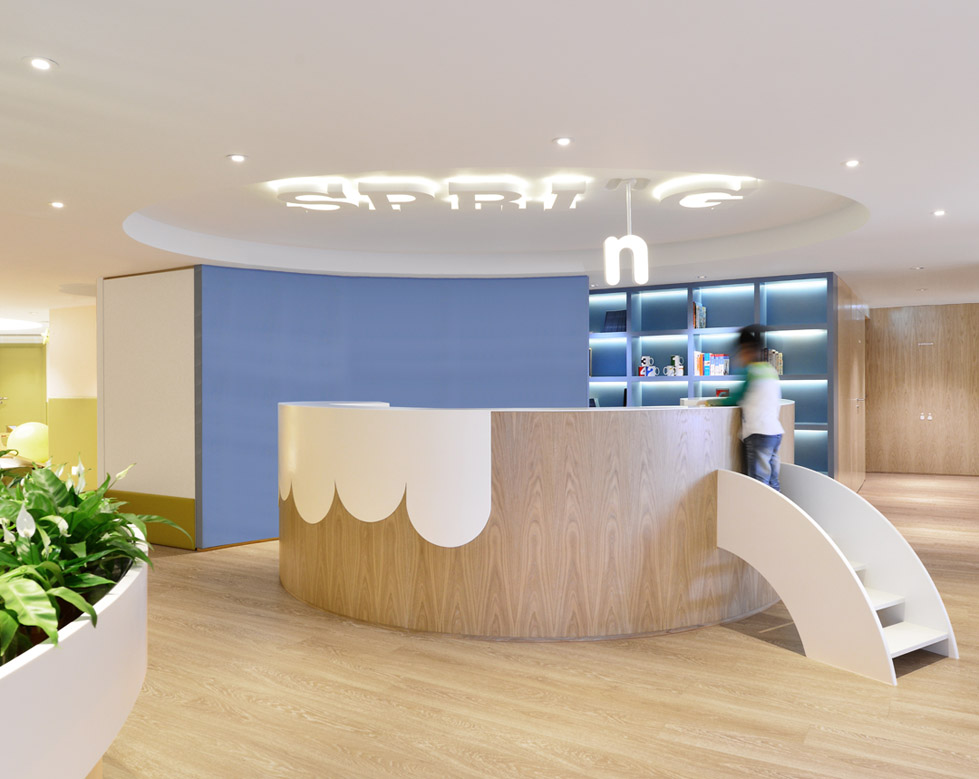 例如香港的Spring少儿学习空间,在接待柜台旁边设置台阶,这样儿童可以和柜台内的工作人员,面对面直接沟通。