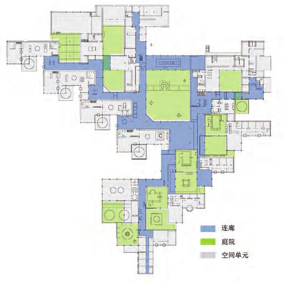 一个较大的庭院与住宅空间形成对角上的偏移,入口和行政空间与街道、大庭院以及住宅单元相连。从空间秩序来说,凡·艾克避免在孤儿院创造一个中心点,营造出丰富的灰空间系统,如同城市中街道,将所有空间之间相连接,承担着通行的功能,还可以产生不同活动,激发某种社会性。在这个孤儿院中,不仅触发了孩童之间的交往、儿童和空间的互动,也吸引着孩子们在此游戏。