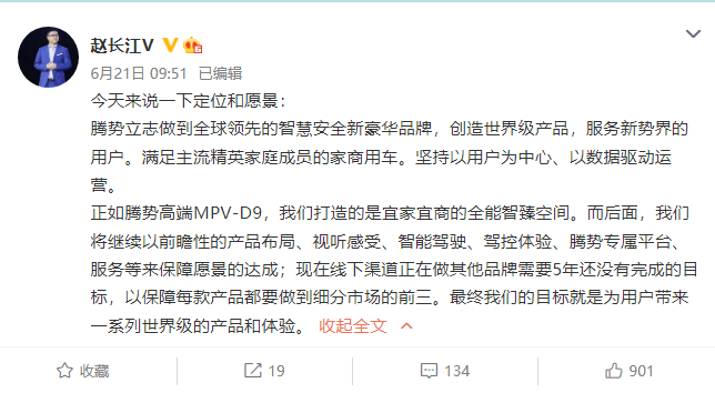值得一提的是,赵长江之前就曾在其个人微博上宣布,腾势今年将推出一款世界级 SUV 概念车,今年将发布三款车型,除已开启预售的腾势 D9 外,另两款新车分别为中大型 SUV 与中型 SUV,本次曝光的全新 SUV 或为中大型 SUV。