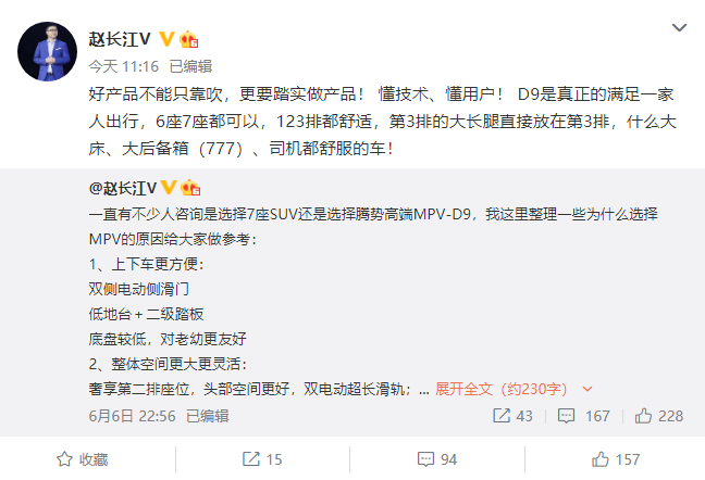 IT之家 6 月 22 日消息,腾势赵长江表示,腾势 D9 将于 7 月开启大定,而且暗示腾势还将在第三季度推出一款 6 座的中大型 SUV。
