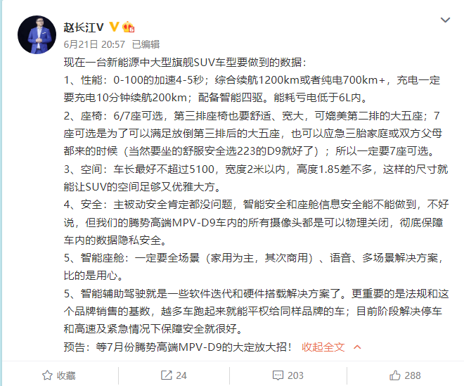 从他给出的数据来看,这款腾势的中大型 MUV 在性能可实现:零百加速 4-5 秒;综合续航 1200km 或者纯电 700km+,充电 10 分钟续航 200km;配备智能四驱,能耗亏电低于 6L 内。