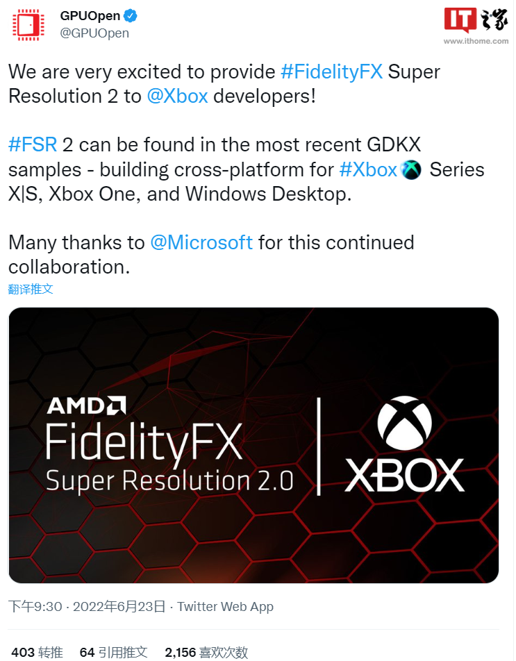 今日,GPUOpen 发布消息,AMD FSR 2.0 已正式面向 Xbox 游戏开发者推出,FSR 2.0 将包含在 Xbox GDK 中,并感谢了微软的持续合作。