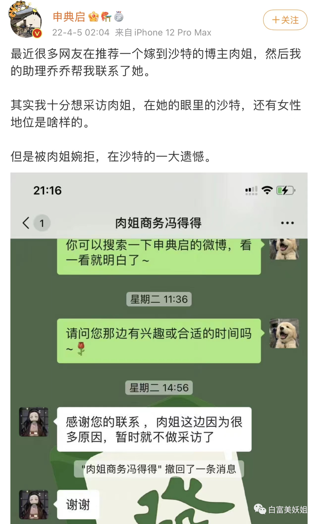 而申典启在沙特的时候,想要和肉妈交流一下,结果被拒绝了。