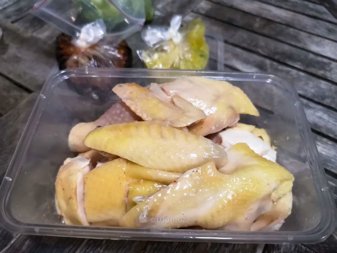 半只白切鸡55,这个价格在广州已经不太容易找到。我们拎着它,走过赤坎老城几条街,搭高铁,又打车过海,最后坐在海陵岛的海景房阳台,听着海涛吃完这只白切鸡。大部分很嫩,有几块略柴,皮很紧实,不过我喜欢吃皮更厚一点的。