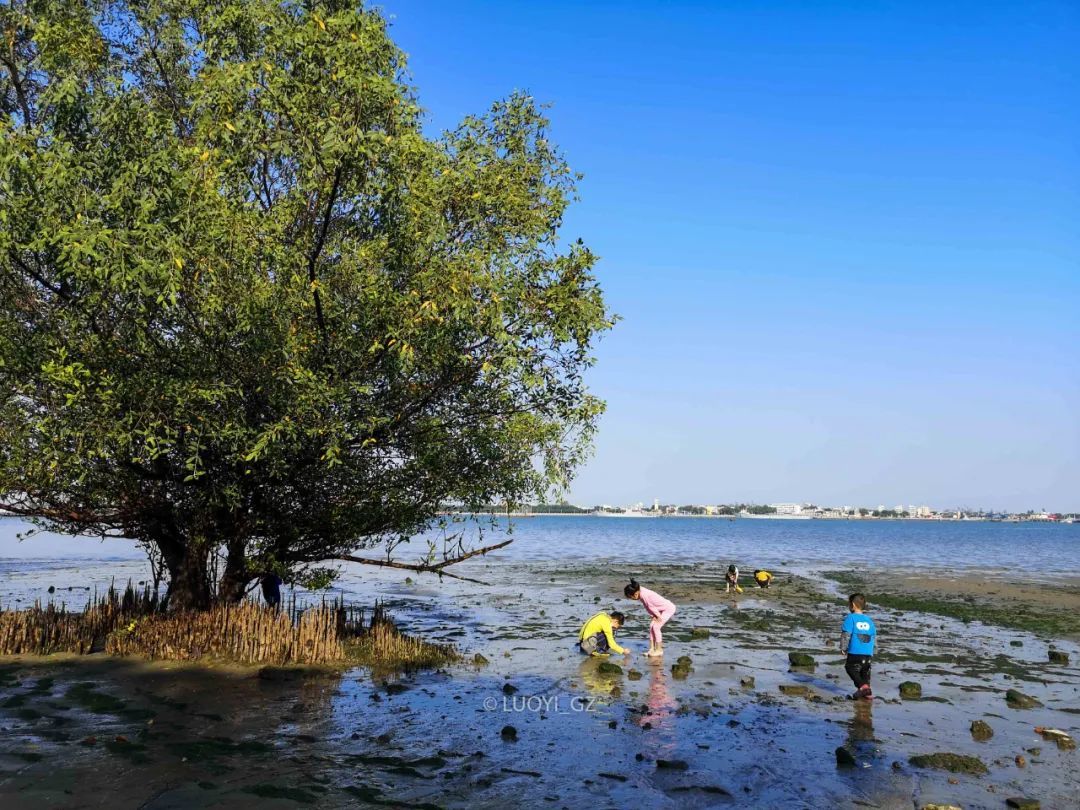 这片海滩是滩涂地,退潮后能看到寄居蟹在洞里爬进爬出,有不少人蹲着埋头挖海鲜。滩涂和陆地之间生长着 中国大陆最南端的红树林 ,都是我没见过的树种,很繁茂,时不时有水鸟飞入林中。