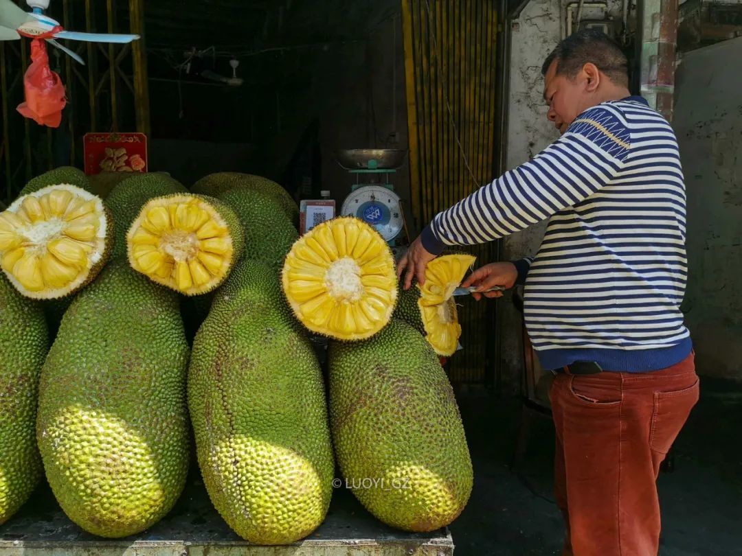 赤坎幸福路,菠萝蜜一条街。北方的同学,菠萝蜜跟菠萝不是一个东西哈,菠萝蜜跟榴莲比较接近。