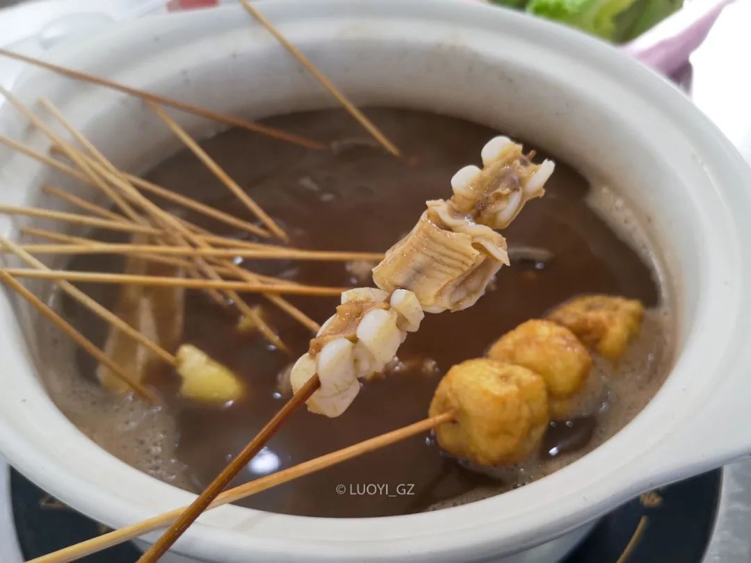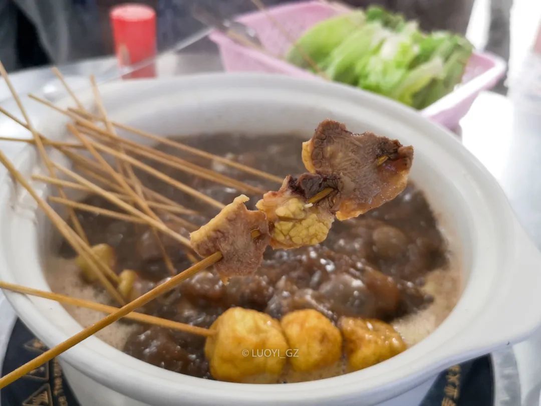 湛江的牛杂吃法跟广州不一样,每桌放一锅卤汤,从冰柜里自取牛杂, 无论部位、无论荤素,一律2元/串,按竹签算钱。