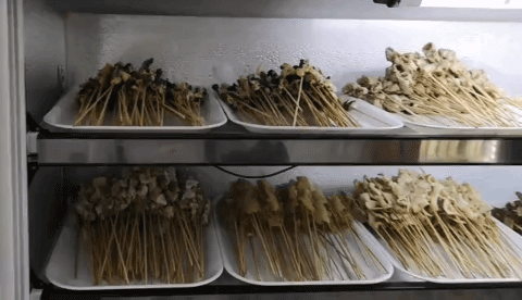 广州牛杂只有几个部位,牛肺、牛肠、牛肚啥的,这里则有一个大冰柜4层满满的,连牛肠都有好几种,也懒得挨个问老板什么部位了,每样来一串。