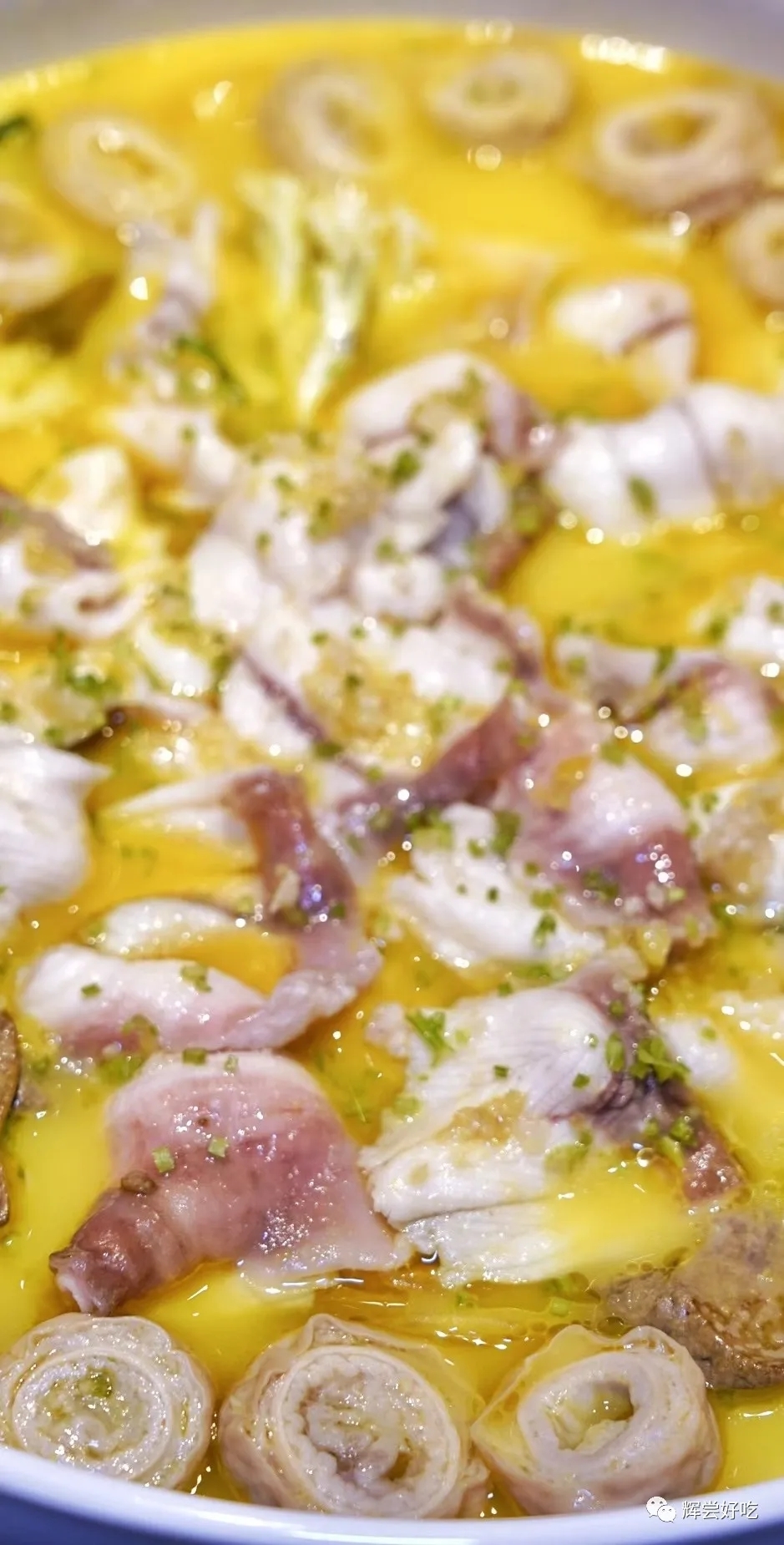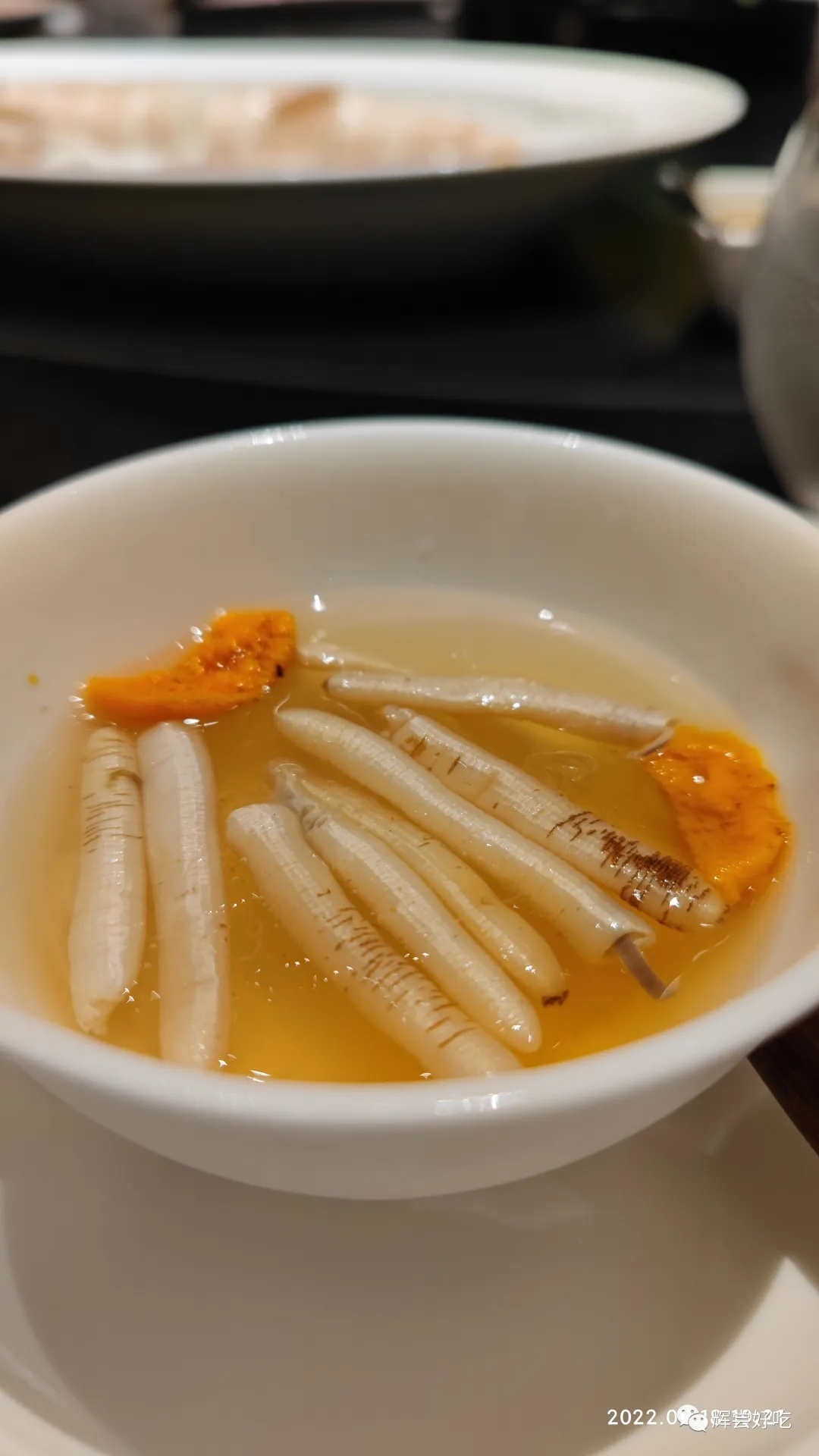竹荪堂灼河田鸡汆沙虫,这也是一个“鲜”的组合:选用福建长汀河田镇的名鸡河田鸡,300天的鸡龄,风华正茂,风味物质丰富,鸡味十足,黄得金灿灿的鸡皮,源于它们吃的主食中有玉米。起肉留骨,骨头熬出鸡汤,鸡肉拿出来堂灼,只需几分钟,鸡肉嫩中带脆,鲜中有甜。这种鲜,不仅仅来自鸡本身,还有沙虫,这东西学名方格星虫,生活在沿海滩涂一带沙泥底质的海域,每年的五月至十月间才会在滩涂上现身。沙虫的鲜美滋味源于体内富含的多种氨基酸,沙虫干体氨基酸含量高达60%左右,尤以谷氨酸的含量最高,约占干重的15%-20%,简直就是天然的味精,再加上竹荪的鸟苷酸,简直就是鲜味代表大会。这种鲜,清澈爽快。