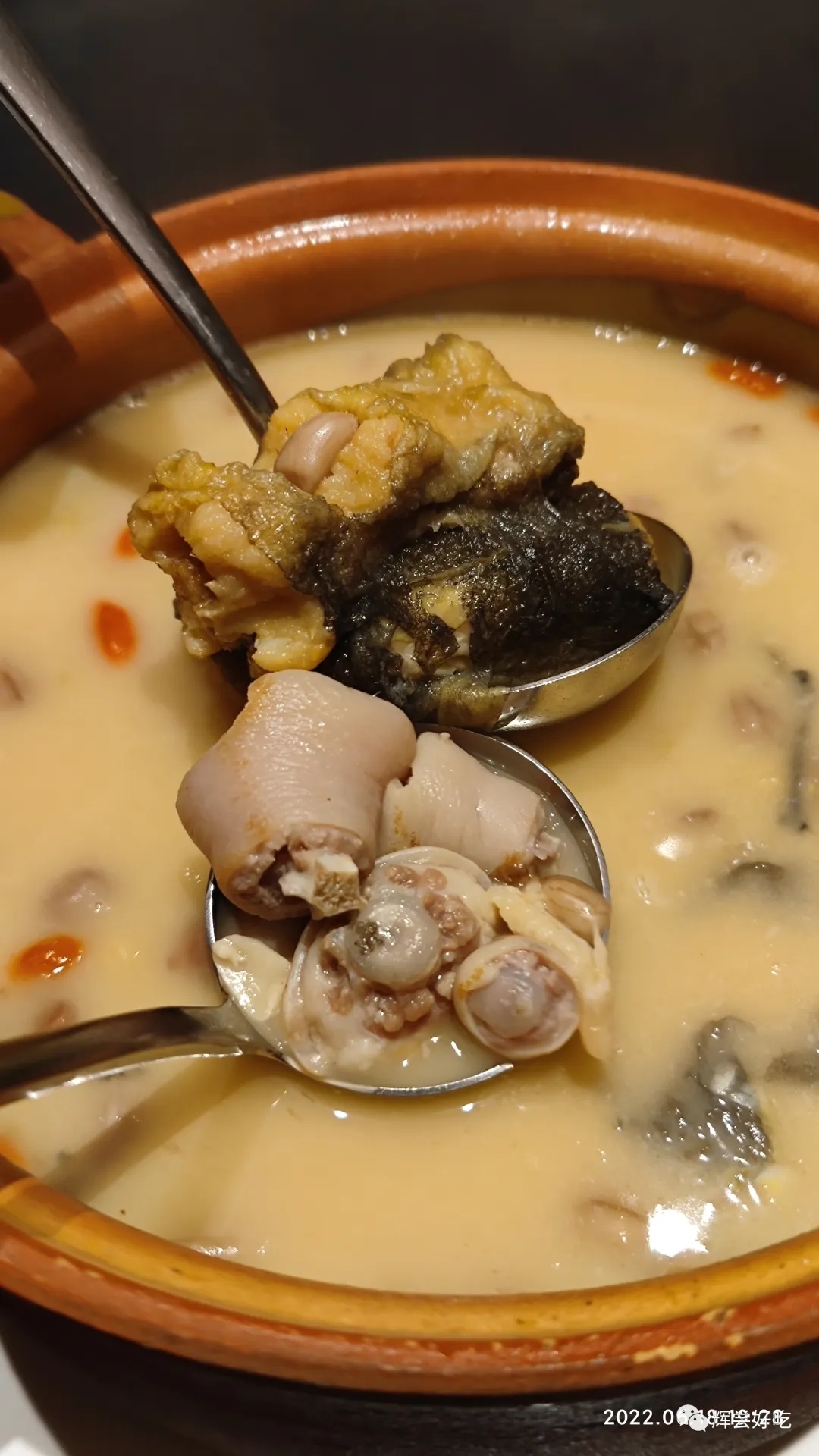 热菜猪尾药膳炖土龙,是厦门人心目中的壮阳利器,厦门人的土龙,就是潮汕人的杜龙,生命力特别旺盛的一种鳗鱼,张新民老师为它找到了理论依据:“鳗”字是左右结构,由“鱼”和“曼”组成,而“曼”字是上中下结构,由“日”、“四”、“又”组成,“一日四次又要”,这还不厉害?吴嵘还给这道菜加了猪尾巴,猪只要没睡着,尾巴就甩个不停,这种持续折腾能力,不由得让人充满了想象。说这道菜壮阳纯属一厢情愿,那方面行不行主要看对象,但这道菜的组合,却是把“鲜”表达得淋漓尽致:猪尾巴贡献了谷氨酸,土龙贡献了肌苷酸,两种氨基酸协同作战,提高了鲜味。烹饪时加了固本酒,在78.4℃时乙醇挥发,猪尾巴和土龙的腥味物质溶于乙醇,又随着乙醇一起飘走,这就是去腥。花生和赤小豆的加入,与猪尾巴、土龙释放出来的胶原蛋白一起,增加了这道菜的黏稠度,让我们吃起来是满嘴的幸福,豆类释放出来的绽粉还形成一层网络,在乙醇逃逸后把香味物质罩住,这道菜吃起来比闻起来更香,又香又鲜,还有传说中的某种功效,你能抵挡得住?这种鲜,浓郁厚重。