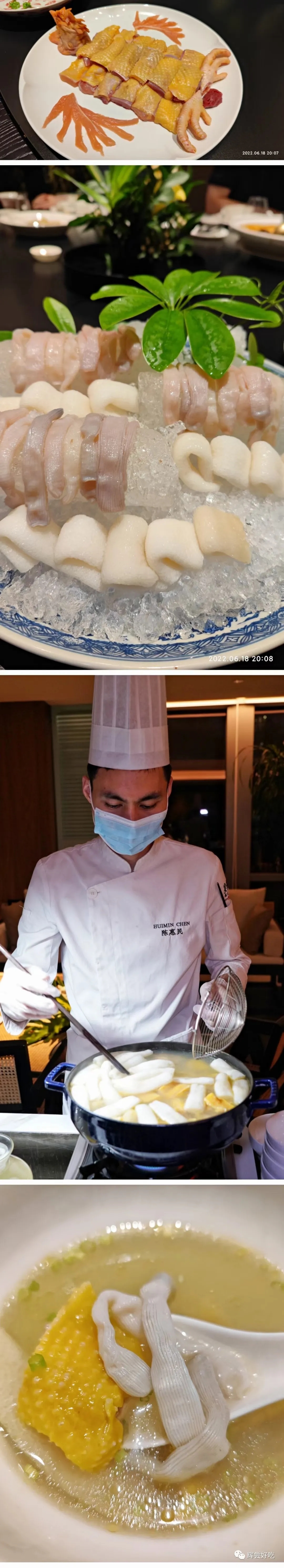 六个前菜,个个都是可以扛起主菜重任的大菜:火灼巴浪鱼,人工饲养的巴浪鱼,不用耗费精力觅食,更多的脂肪,弥补了巴浪鱼肌纤维过粗的毛病,更加细腻多汁。用火烤,高温使大分子蛋白质分解为呈鲜味的小分子氨基酸,那种鲜,是从巴浪鱼多脂的香中蹦出来的;福建老酒醉老蛏,老蛏子煮熟后再用老酒调味,两老相伴,老酒的甜伴着老蛏的鲜,老酒的醇盖住老蛏的腥,这种鲜,是烘托出来的;金门高梁水晶肉,七天腌制晾晒的腊肉,这算经历了一点小风霜的小鲜肉,蛋白酶对蛋白质进行分解,产生小分子氨基酸,这是鲜味产生的另一条路径,这种鲜,是逼出来的;将肥瘦精肉、荸荠、葱等用五香粉调味,再用豆皮一裹,上油锅一炸,潮州菜叫“粿肉”,福建叫“五香卷”,这种鲜,来自于肥瘦精肉,隐藏于五香粉的香和荸荠的甜中,是“大隐隐于市”式的鲜;福建人口中的“大管”鱿鱼,其实就是长枪乌贼,又叫火箭鱿鱼,有的地方还叫它大工、笔管、炮管,休渔期只能海钓,因为足够新鲜,只需白灼,鱿鱼丰满的游离氨基酸已经足够丰富,这种鲜,是简简单单又赤裸裸的;厦门名小吃土笋冻中的土笋,就是弓形革囊星虫,栖身于沿海滩涂约10厘米深的泥沙中,广东人称之为“泥丁”,说的是它似埋在泥沙中的钉子。福建人叫它“土笋”,说的是它象泥土里的小肉笋。土笋富含胶原蛋白,放在水里加热,胶原蛋白分解为明胶,然后放凉,胶原蛋白在25°C时凝固,这就是土笋冻了。土笋冻色泽晶莹剔透,口感鲜弹爽滑,透着一股淡淡清鲜,再加上马粪海胆,鲜上加鲜,这种鲜,是有点暴力倾向的鲜!