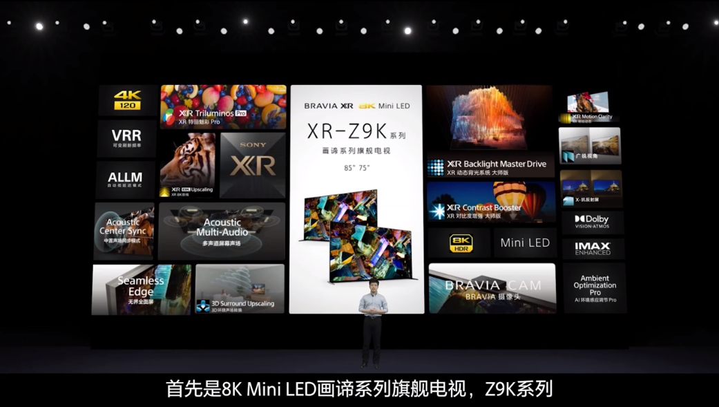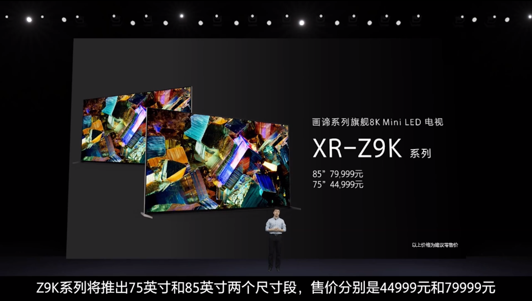 8K Mini LED画谛系列旗舰电视Z9K系列搭载了XR认知芯片,支持XR动态背光系统大师版、XR对比度增强大师版技术。同时支持多声道屏幕声场、支持杜比视界、杜比全景声、IMAX ENHANCED,全系标配BRAVIA摄像头。Z9K系列提供75、85英寸两种尺寸,其中75英寸售价44999元,85英寸售价79999元。同步带来的还有4K分辨率Mini LED电视X95EK系列,提供三种尺寸,65英寸版本售价16999元,75英寸版本售价24999元,85英寸版本售价31999元。