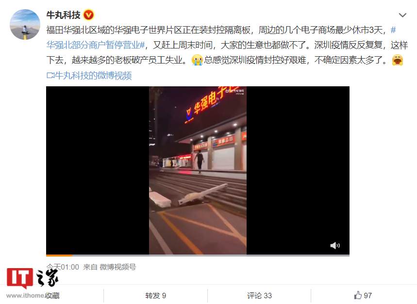 有网友称,福田华强北区域的华强电子世界片区正在装封控隔离板,周边的几个电子商场最少休市 3 天。
