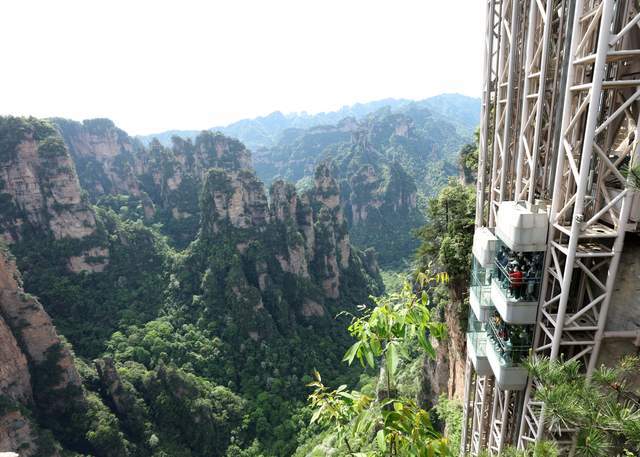 2002年投入营运的百龙天梯垂直高差335米,运行高度326米,由154米的山体内竖井和172米的贴山钢结构井架组成,采用三台双层全暴露观光电梯并列分体运行。2013年,百龙天梯进行扩容提速后,每台上下两层单次载客可达64人,运行速度提高到5米/秒,单程仅需1分28秒,三台天梯的总运力每小时升至约6000人,将武陵源景区内的袁家界、天下第一桥、迷魂台等山上核心游览景观与山下的金鞭溪、水绕四门、十里画廊等游览景观有机连接起来,为游客带来全新舒适的服务与体验。