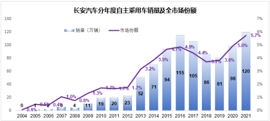 2021年,长安共销售自主乘用车120万辆,5.7%的市占率达到历史最高水平,这些数字为长安汽车“三次创业”提供了最好的注脚。