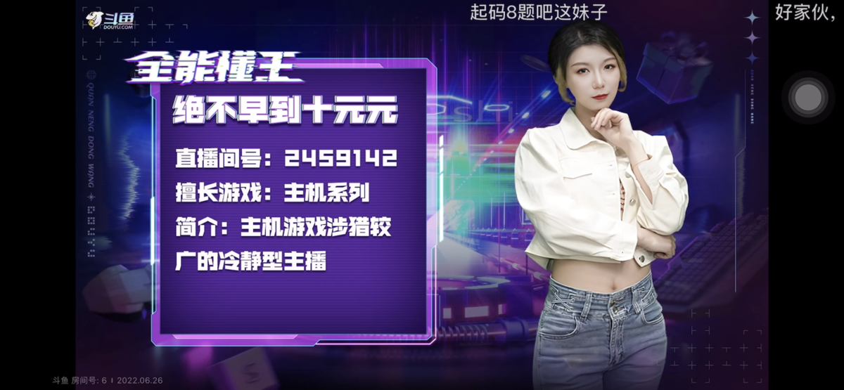 今天直播一开始就整活了,除了有漂亮的Coser小姐姐开场之外,斗鱼的主机区的颜值大佬主播十元也来到了线下参赛,明显看到十元小姐姐一出现弹幕也是异常活跃了,十元表示自己可能不是最高的段位,但涉及的游戏范围比较广,疯狂立Flag,答对13题要是没达到,今晚直播间跳舞!小编有个疑惑:立Flag这是不是斗鱼的企业文化,你们还记得大明湖畔的骚易吗?
