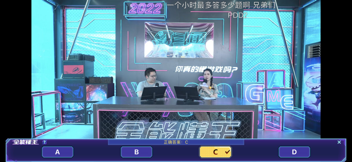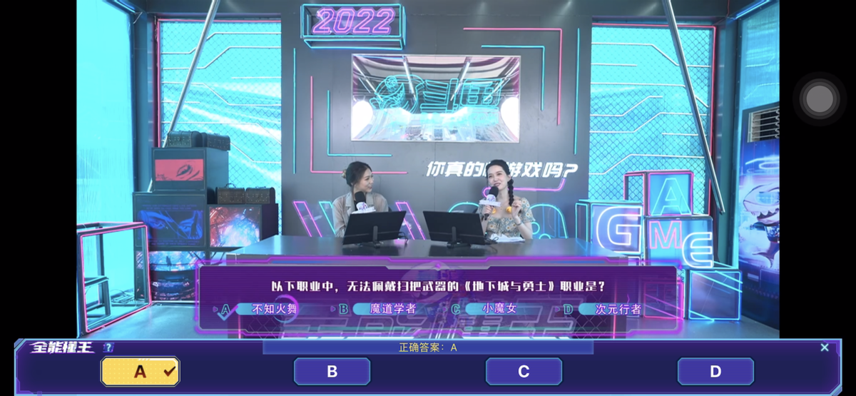 青铜阶段的五题对十元来说就是洒洒水啦~不过我要强烈控诉这个题库,遇到美女就开始放水了,像一下职业中,无法佩戴扫把武器的《地下城与勇士》职业是?A.不知火舞 B.魔道学者 C.小魔女 D.次元星者 这十元能不知道吗?不知火舞是《王者荣耀》的角色啊!不过后面的题目也是越来越难了,在13题时回答错误了失败了,不过在一众水友的强烈呼唤下成功复活,十元大喊“我胡汉三又回来了”~美女是不是都是搞笑女属性啊!但还是没能达成Flag,今晚8点大家坐等十元跳舞吧!