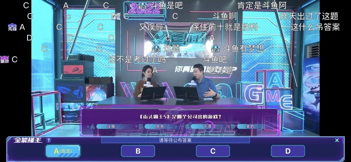 有意思的是在参赛者答题时,遇到了这样一道题:《街头霸王5》是哪个公司出的游戏?A.斗鱼 B.京东 C.卡普空 D.美的 弹幕水友:为了梦想选一手斗鱼~格局打开!这档由斗鱼官方举办的直播综艺《全能懂王》,在今晚10点就将结束了,感兴趣的水友赶紧锁定斗鱼官方6号直播间,还没参与线上答题的“懂王”赶紧冲鸭!