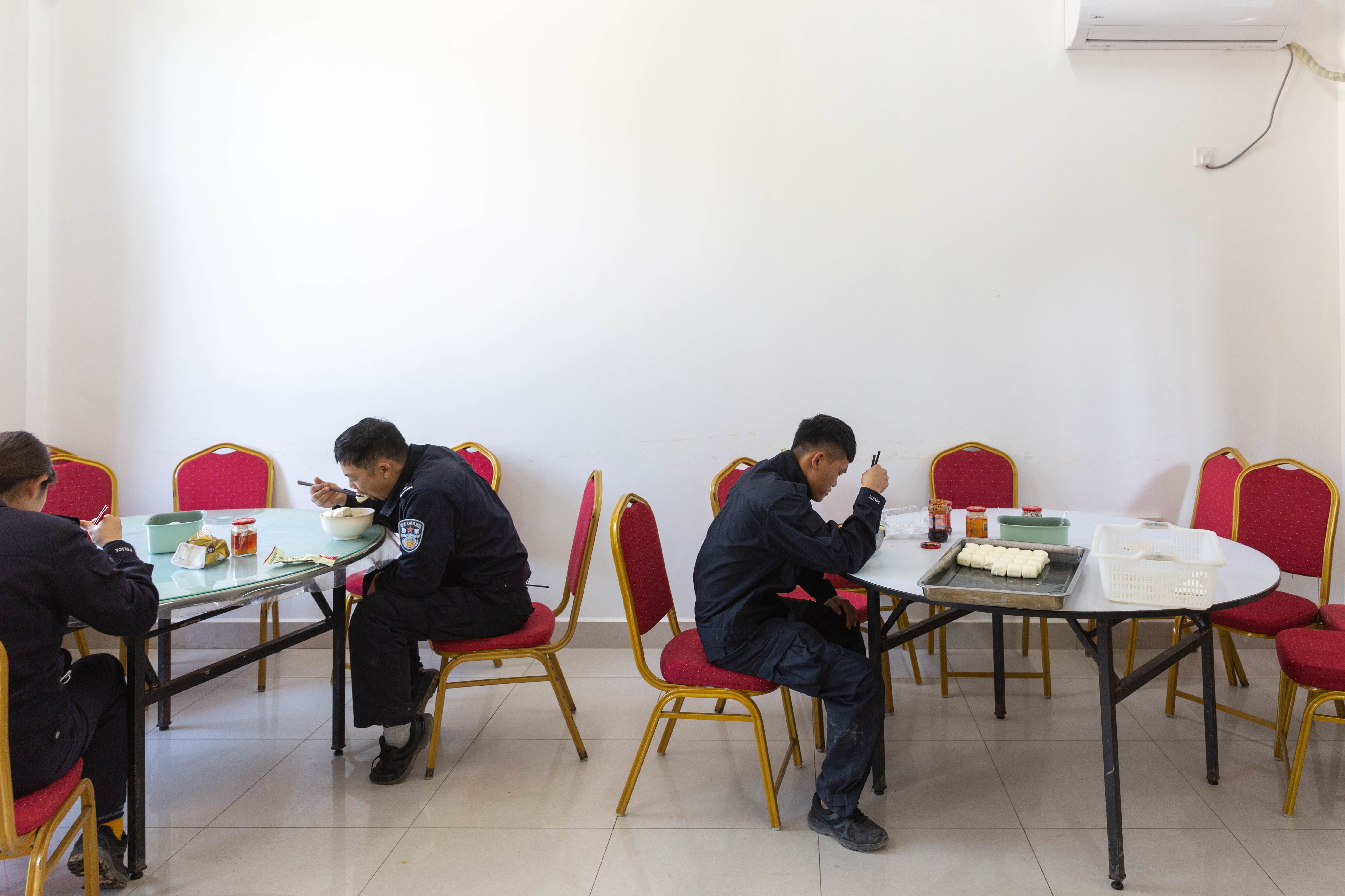 2021年12月20日,云南西双版纳边境管理支队大开河边境检查站,民警轮流在食堂吃午饭。