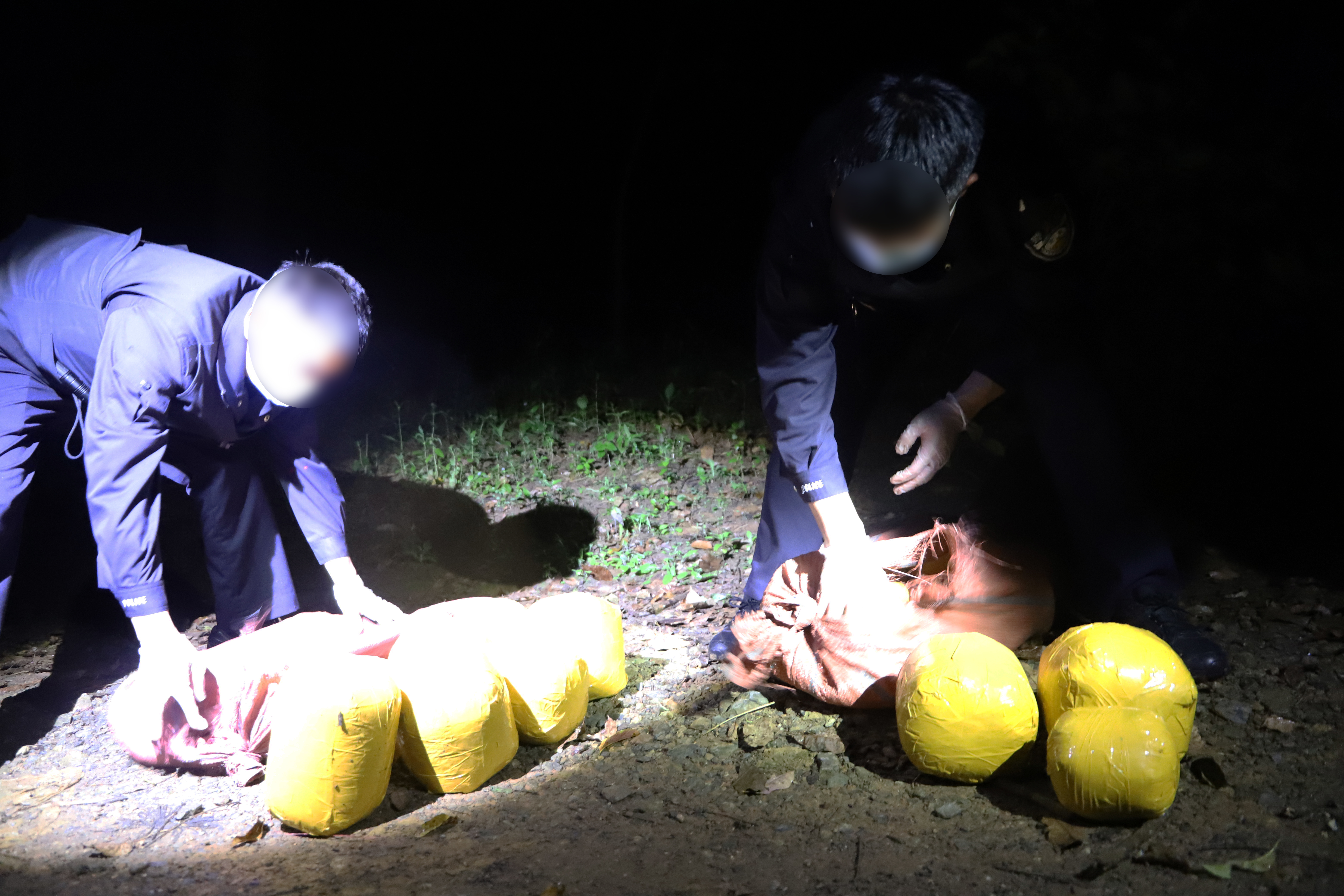 2022年1月1日,云南西双版纳边境管理支队大开河边境检查站执勤民警在景洪一边境小路开展巡逻防控勤务。在检查点不远处有微弱灯光晃动,执勤民警立即前往灯光所在位置进行排查,看见一个身影丢弃2个蛇皮口袋消失在密林深处。图 / 大开河边境支队
