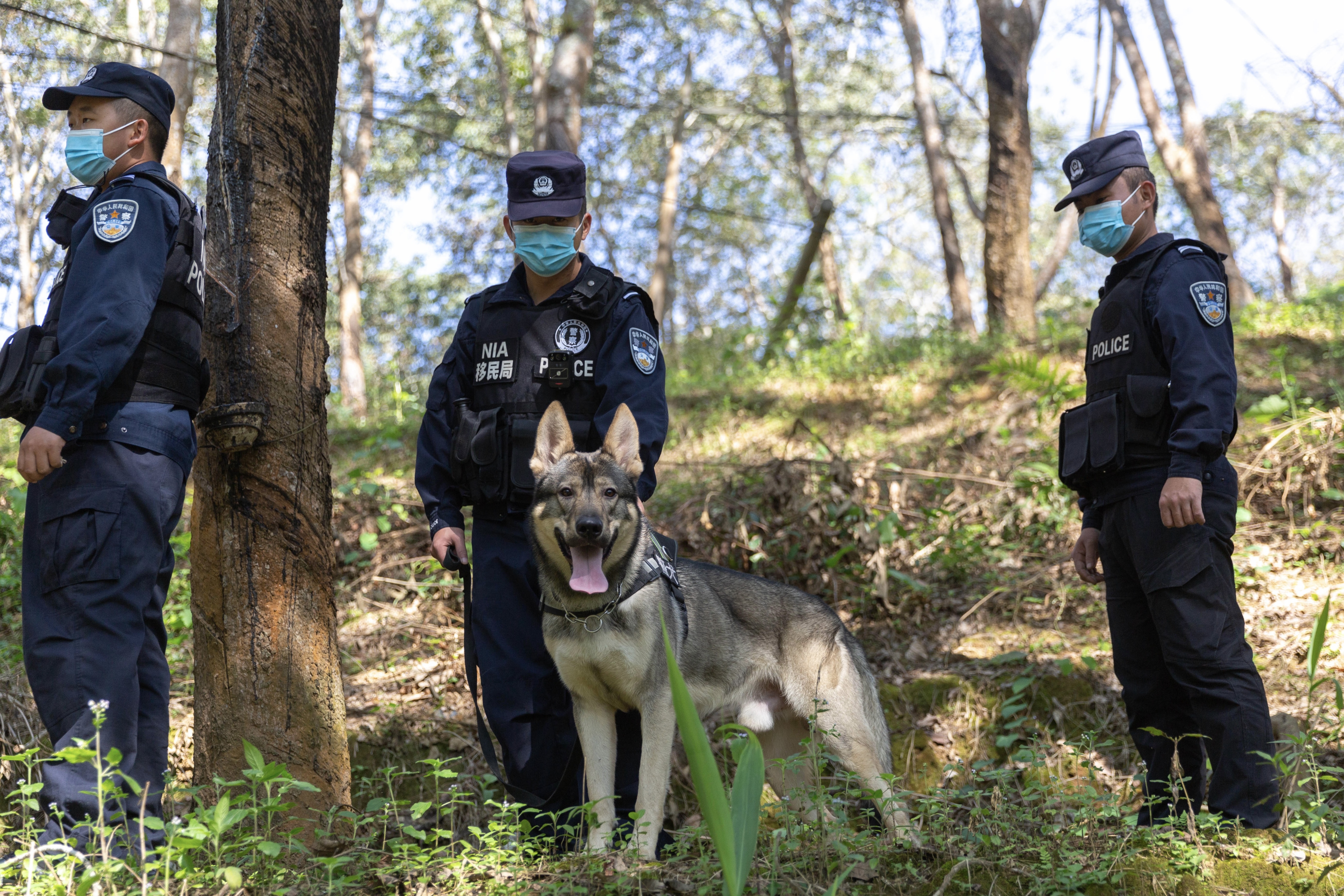 2021年12月20日,云南西双版纳边境管理支队大开河边境检查站,受过缉毒训练的警犬跟着民警巡逻。