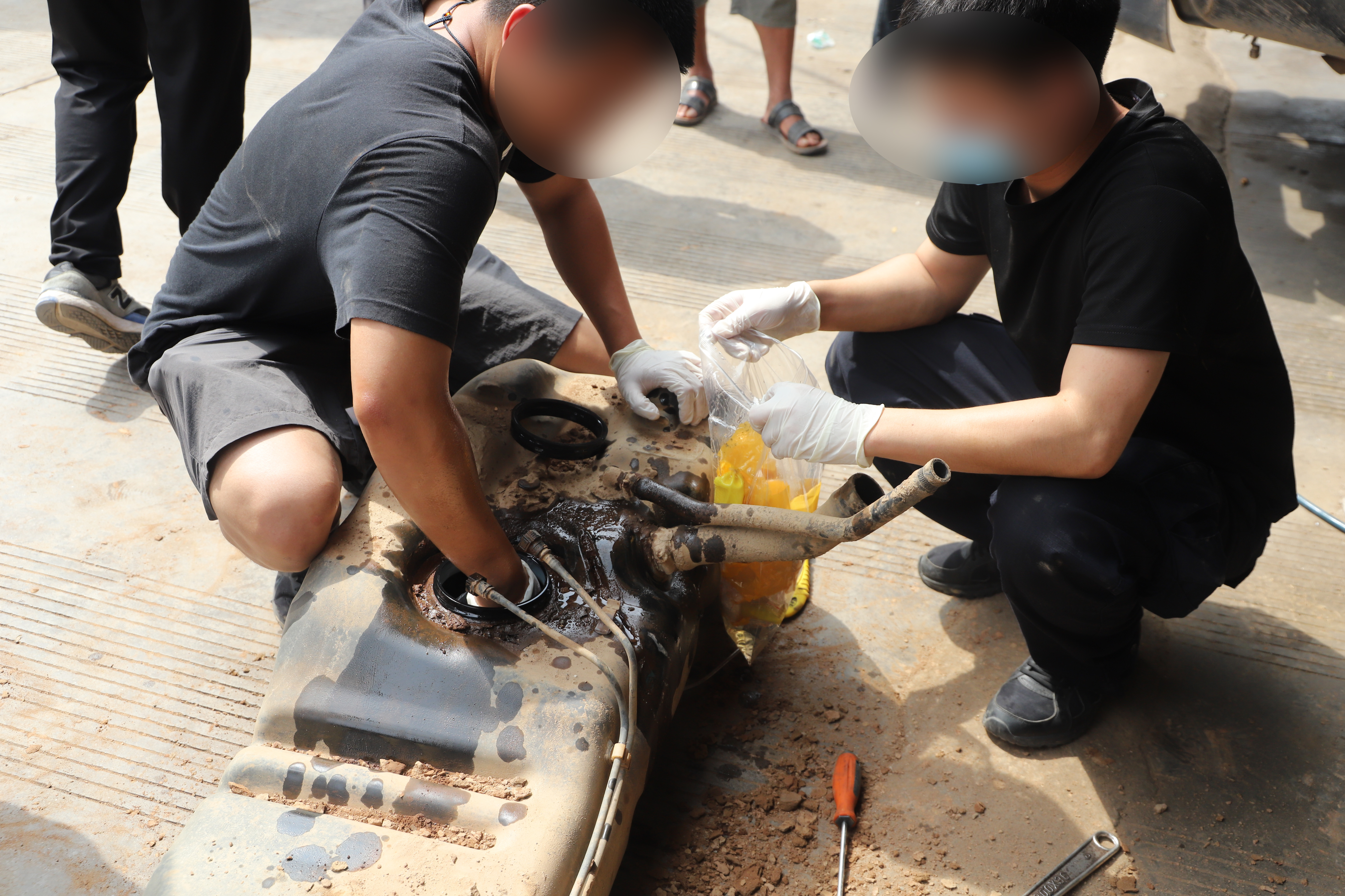 2022年5月18日,西双版纳边境管理支队大开河边境检查站查获一起利用汽车油箱藏毒案,缴获冰毒1.6千克,抓获贩毒嫌疑人1人,查扣涉案车辆1辆。图 / 大开河边境支队