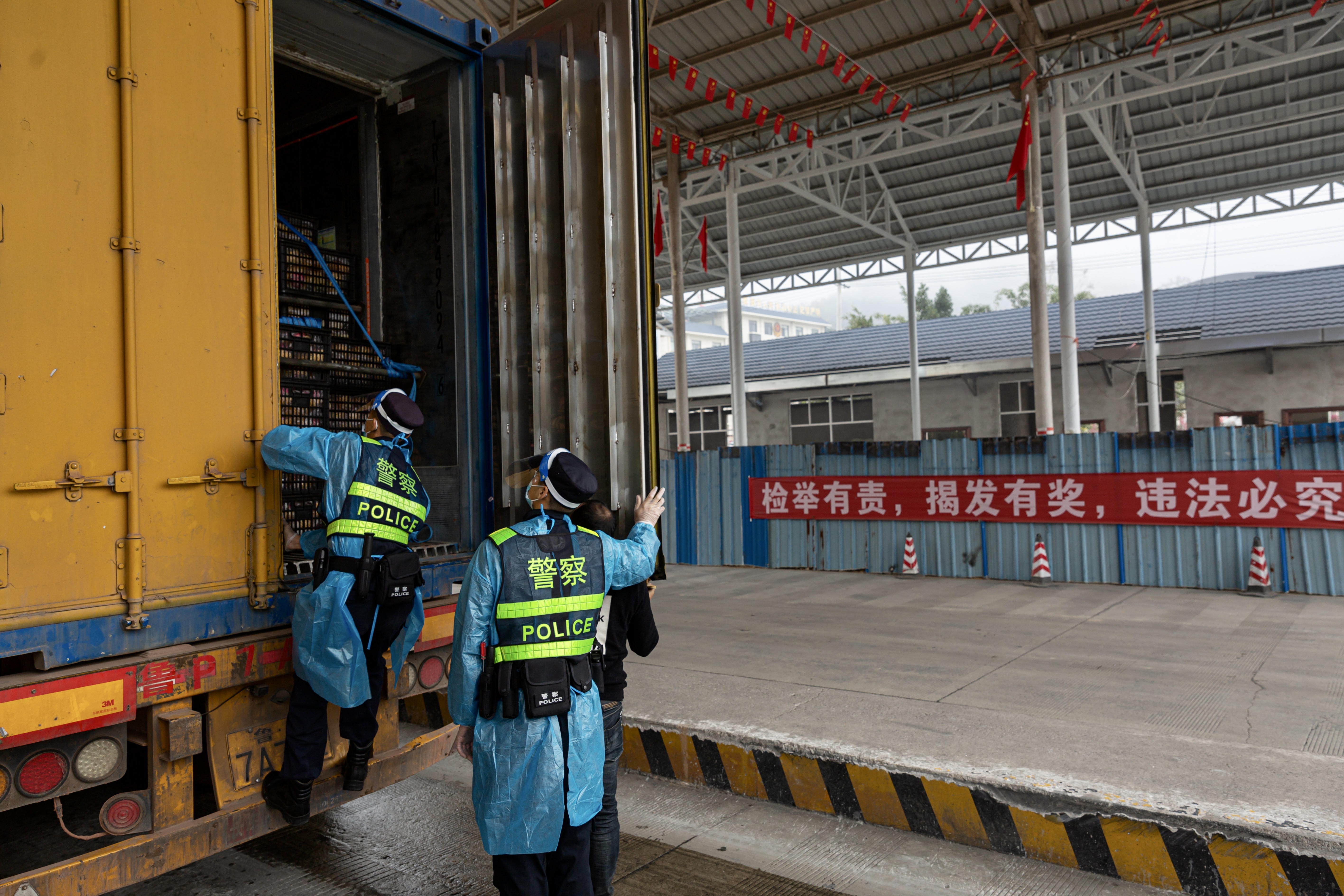 2021年12月20日,云南西双版纳边境管理支队大开河边境检查站,民警们对过路的货车进行逐一检查。