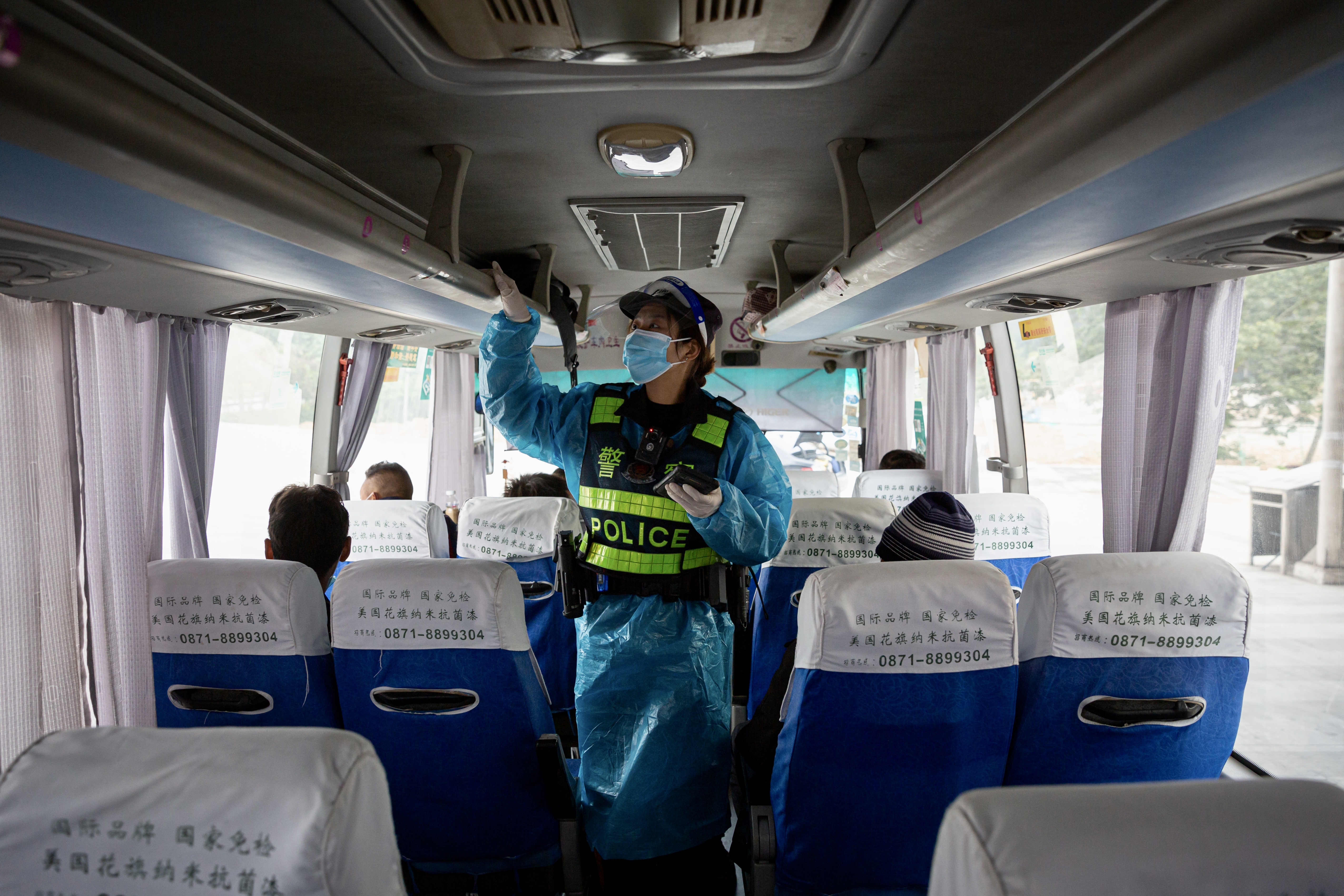 2021年12月20日,云南西双版纳边境管理支队大开河边境检查站,民警们对过路的客车进行逐一检查。