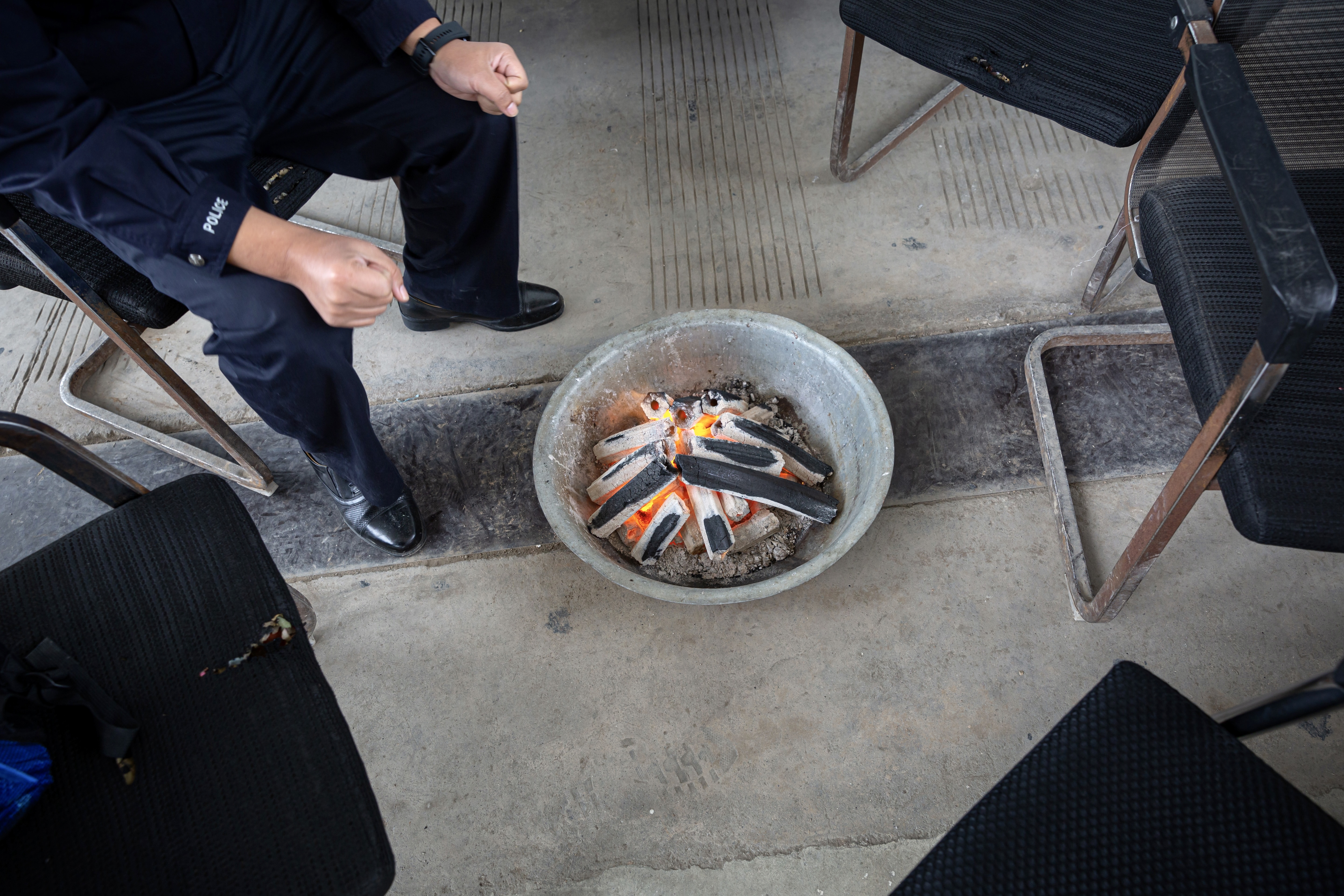 2021年12月20日,云南西双版纳边境管理支队大开河边境检查站,当地早晚温差大,执勤民警轮流休息,烤火取暖。