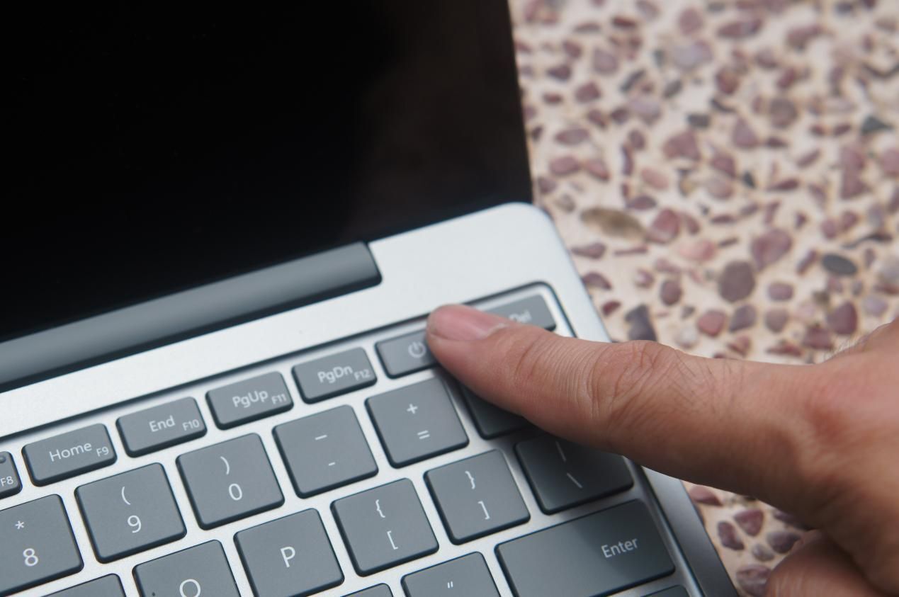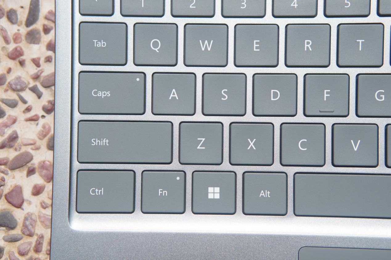 电源按钮位于键盘区右上角,该按键集成了指纹识别模块,支持开机一键登录。很多笔记本厂商都将电源按钮设置在键盘区的右上角,与Delete按键离得很近,文字录入时容易误触到电源键,而Surface Laptop Go将电源键放在了右面第二个按键的位置,按键压力与其它键不同,需要更大的力气才能按动,并且右边Delete键还略宽一些,有效避免了误触。