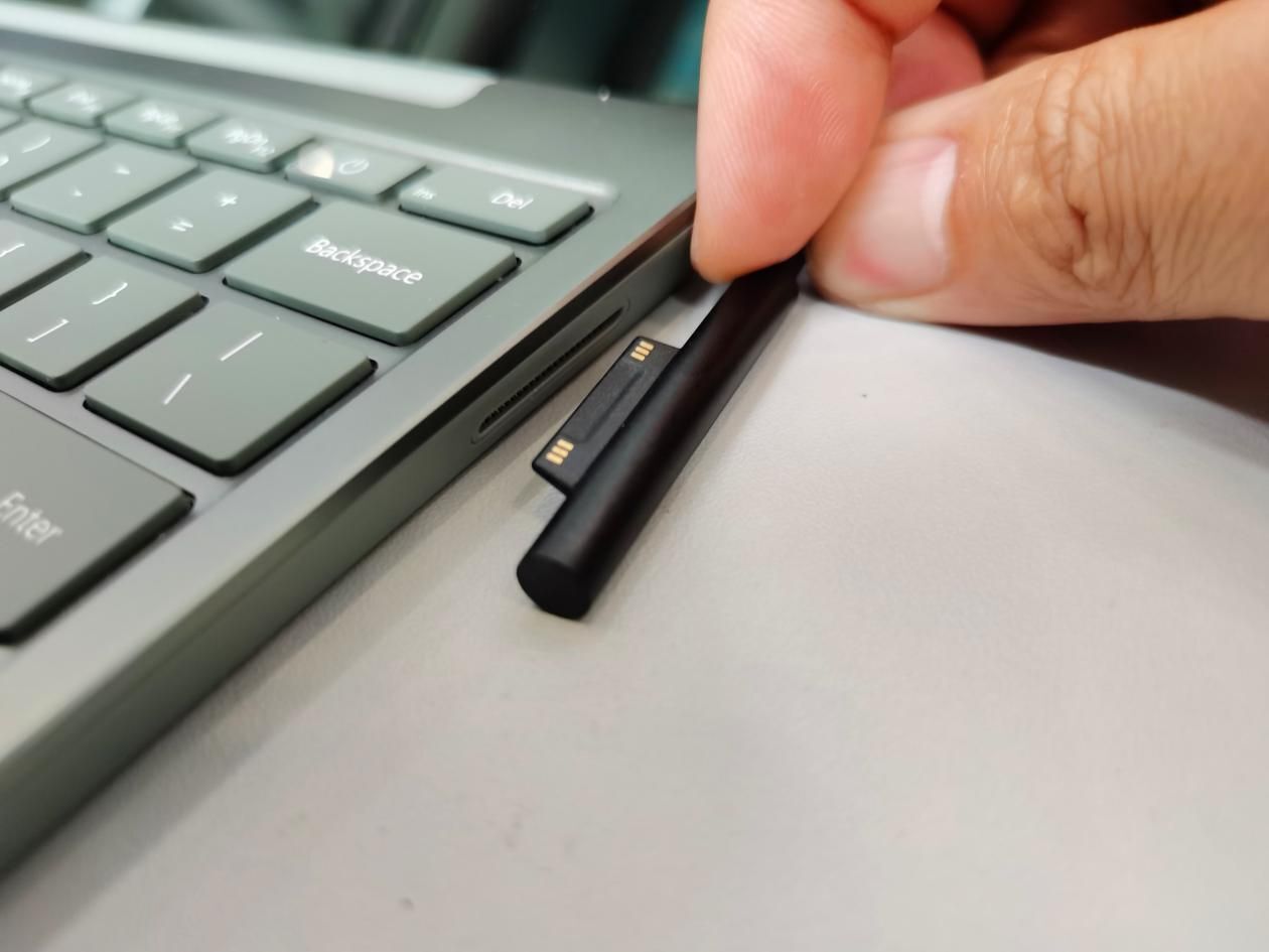 右侧配有微软经典的Surface Connect磁吸接口,这个接口也许是很多用户选择Surface的原因吧,这种电源接口不仅插拔方便,一旦在充电过程中有人不小心绊到线缆,充电接头会自动脱落,降低了电脑摔落的风险。