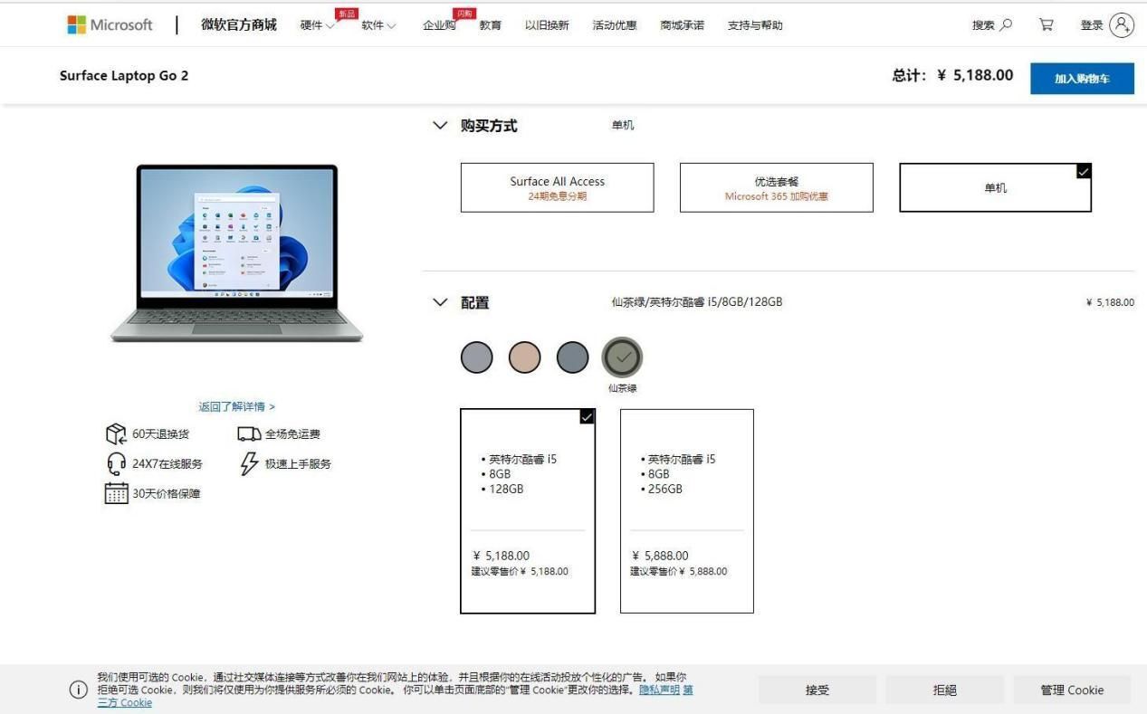 价格方面,目前在微软官方商城8G/128GB版本售价为5188元,8G/256GB版本售价为5888元。