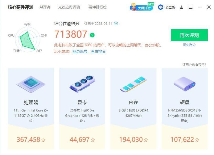 用鲁大师6进行整体测试,电脑综合性能得分为713807,这个分数对于一款商务办公本来说还不错,虽然性能不及标压处理器,但和一些采用奔腾低功耗处理器的笔记本相比性能提升十分明显,毕竟功耗、性能和便携性需要有所取舍。