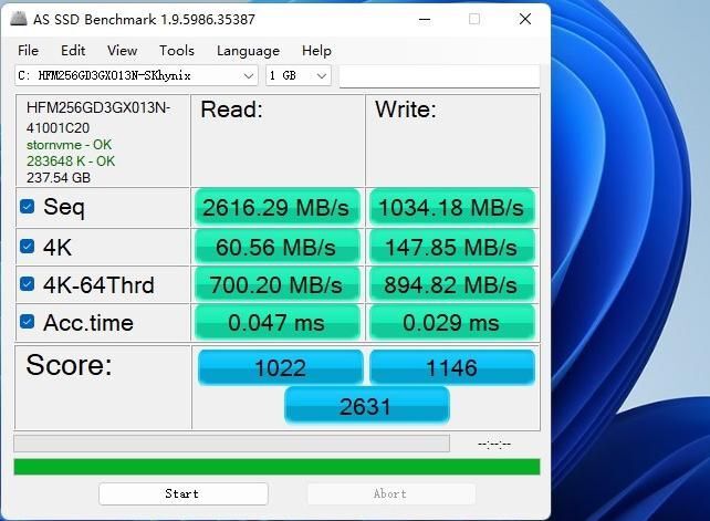 硬盘方面,使用AS SSD Benchmark进行测试读取速度可达2616MB/s以上,写入速度也在1034MB/s以上,能够满足大部分用户对于硬盘读写速度的要求。