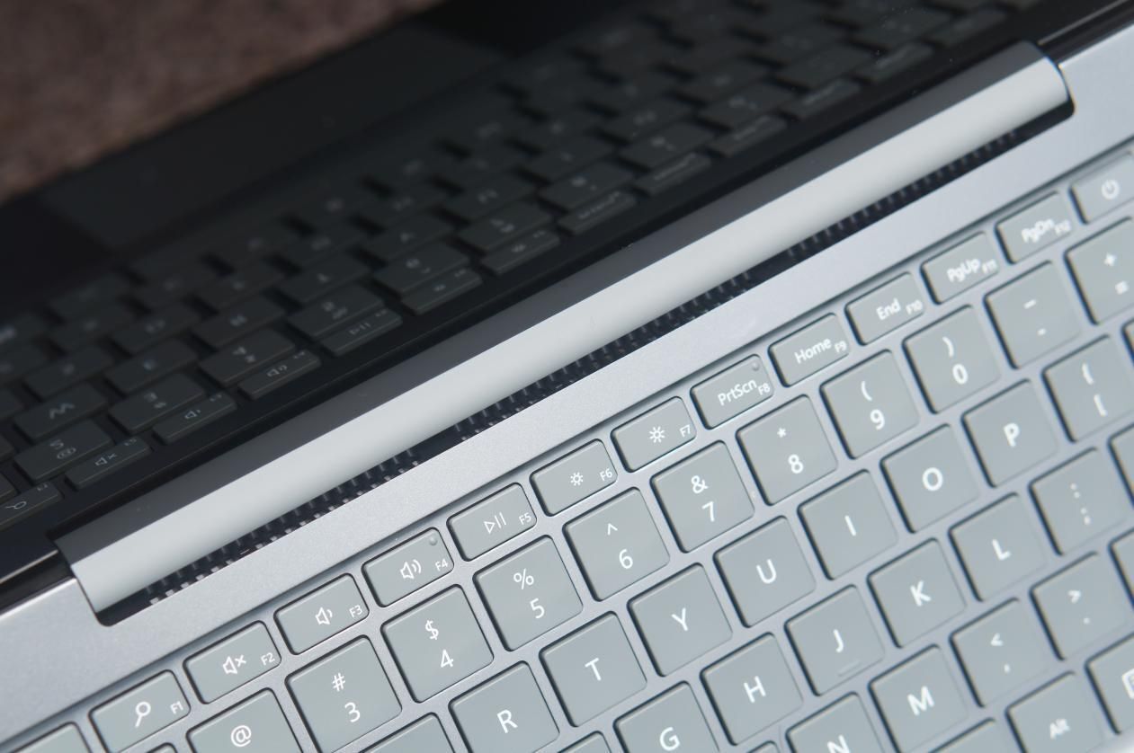 Surface Laptop Go2背部没有散热孔,只有上下两条防滑橡胶,放在身上或床上使用时不用担心散热问题。机身散热孔位于在键盘区域顶部,这种设计更加方便笔记本在柔软材质的表面使用。