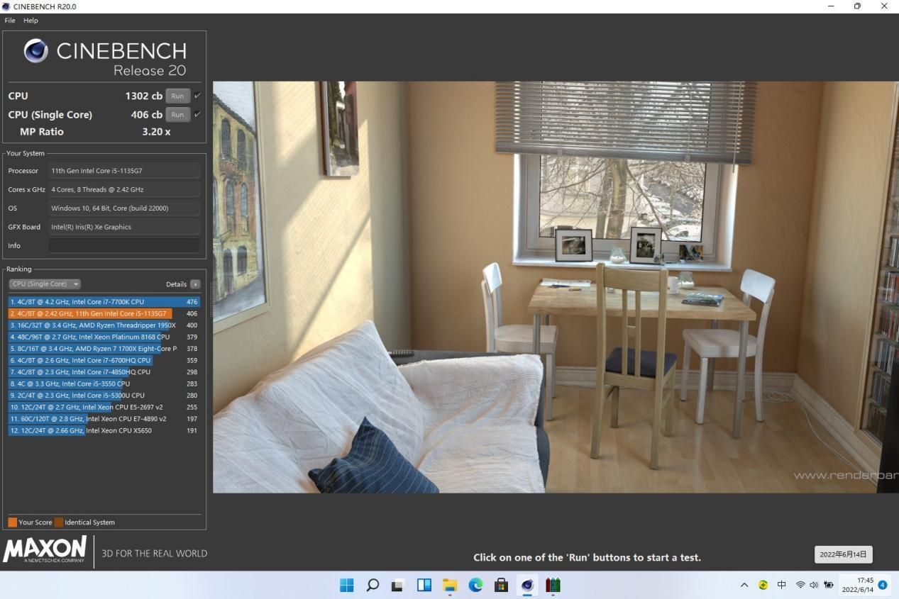 CINEBENCH R20测试,CPU多核得分为1302cb,单核得分为406cb,这个成绩在酷睿10nm级别低功耗处理器中可以算得上优秀了,对于办公、网页浏览、看视频等日常应用来说完全没有问题。