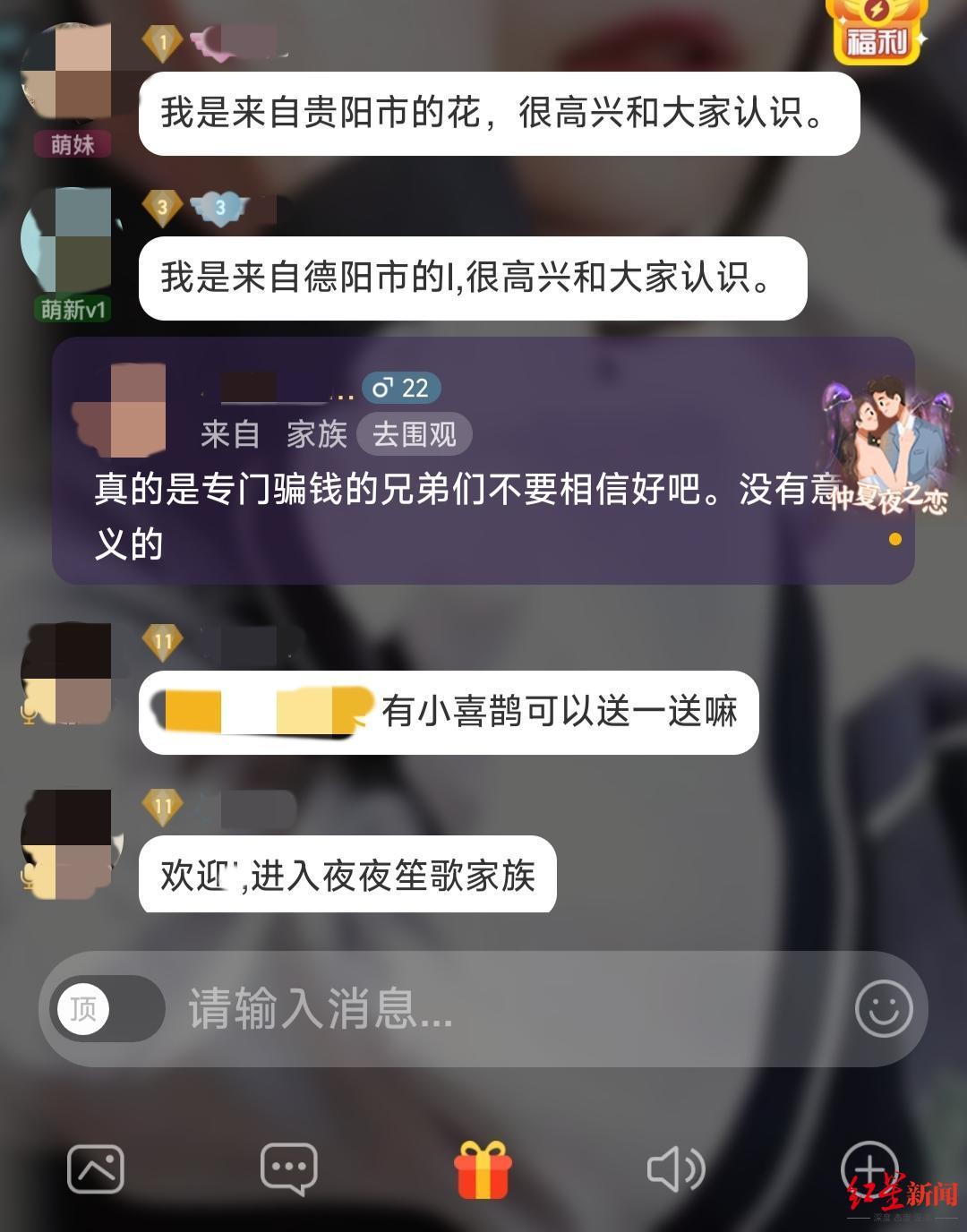 21日晚十点半,名为“小唐”的用户在“夜夜笙歌”家族里发消息说:“真的是专门骗钱的,兄弟们不要相信好吧,没有意义的。”当时聊天室里没有官宣活动,这条消息很快被家族内的其他聊天刷了过去。