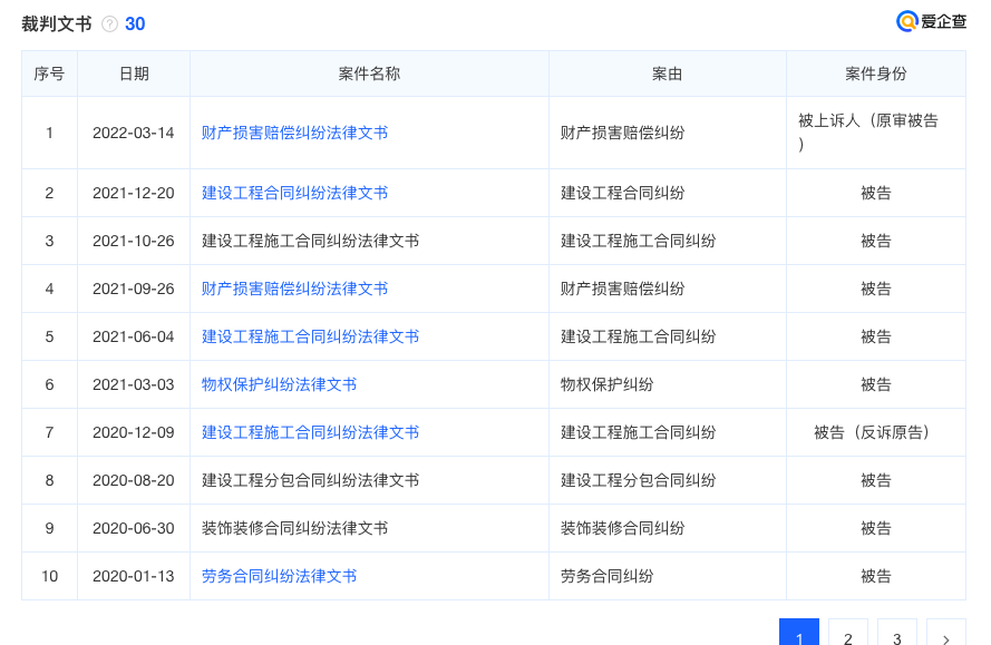 从2015年开始到目前为止,爱企查上对外公示的裁判文书就有30份,仔细看,大多是工程纠纷。