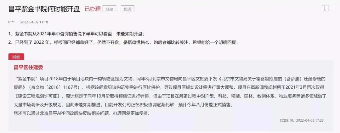 早在4年前,紫金书院在售卖前夕,又因为霍营娘娘庙迁建修缮事件,被紧急叫停,此后项目一直没了动静。
