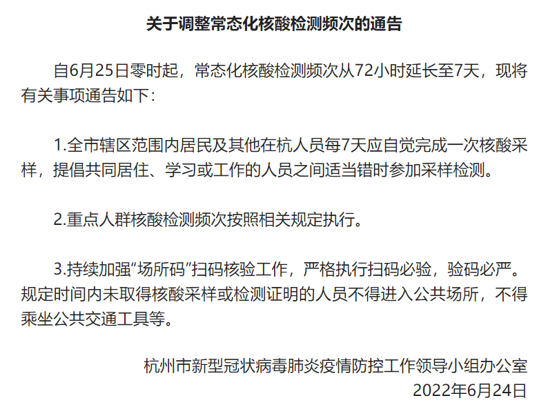 6月24日,杭州市新型冠状病毒肺炎疫情防控工作领导小组办公室发布通告:自6月25日零时起,常态化核酸检测频次从72小时延长至7天。