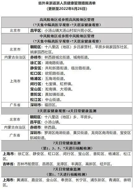 6月26日,浙江省防控办发布了最新的省外来浙返浙人员健康管理措施清单。其中明确,上海中风险地区及参照中风险管理的区域返浙需要实行7天集中隔离医学观察+7天居家健康观察(以下简称“7+7”),这个区域涉及8个区的7个街道和4个镇。