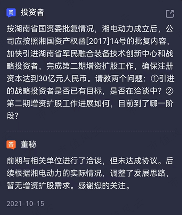 直到2021年10月,公司董秘一则e互动回复揭开了谜底:由于未达成协议,二期扩股实际已不了了之。