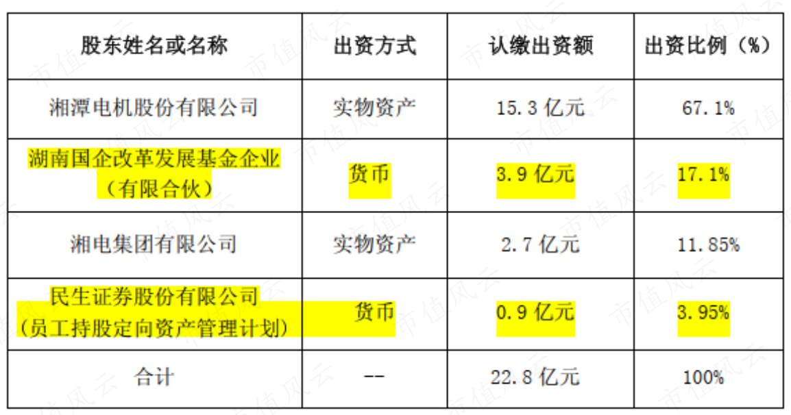 国改基金是当地国资委的基金,民生证券是湘电动力员工内部持股平台,这意味着湘电动力在组建的过程中,没引入一分钱外部资金。