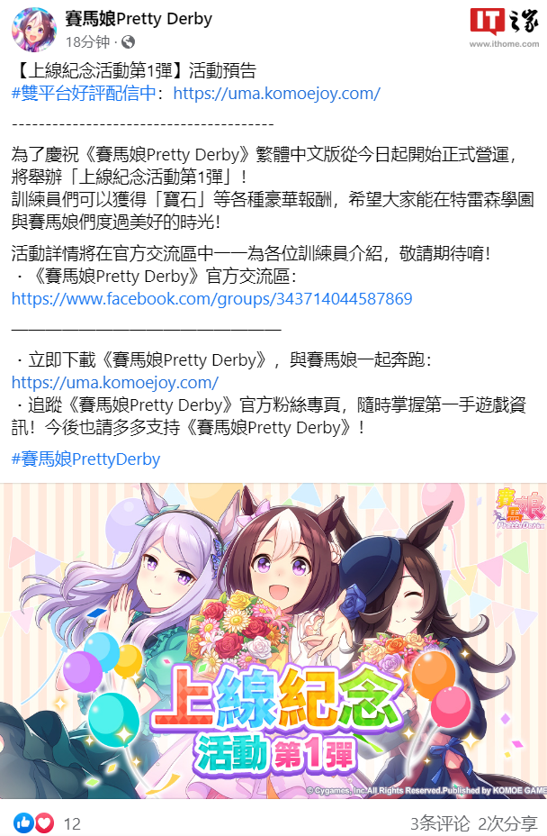 IT之家 6 月 27 日消息,由日本 Cygames 开发、小萌科技代理的热门养成游戏《赛马娘 Pretty Derby》繁体中文版今日(6 月 27 日)正式上线。