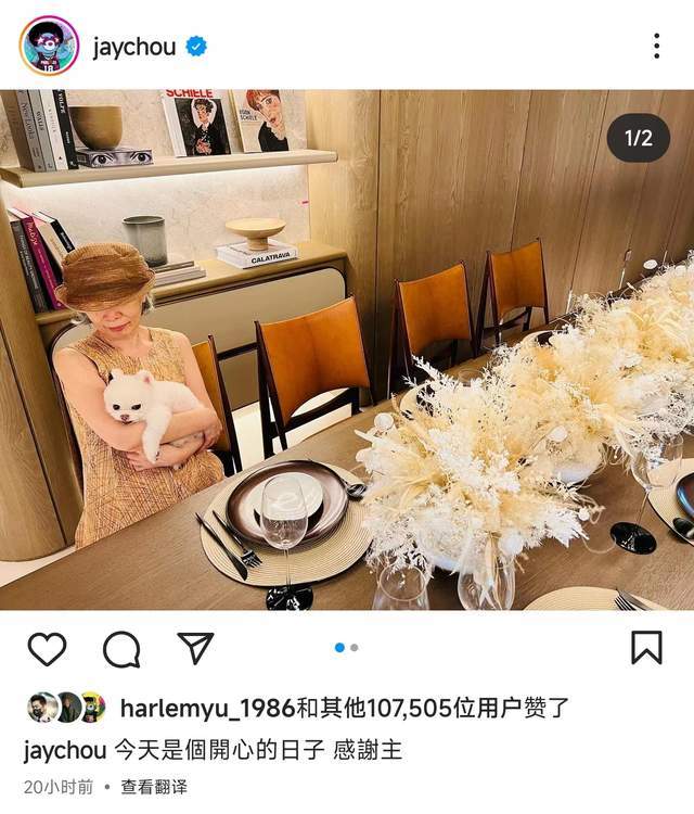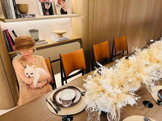 从周杰伦晒出的照片中可以清楚地看到,叶惠美抱着一条可爱的小狗狗,坐在餐桌前像淑女一般温柔,显得特别的有气质。