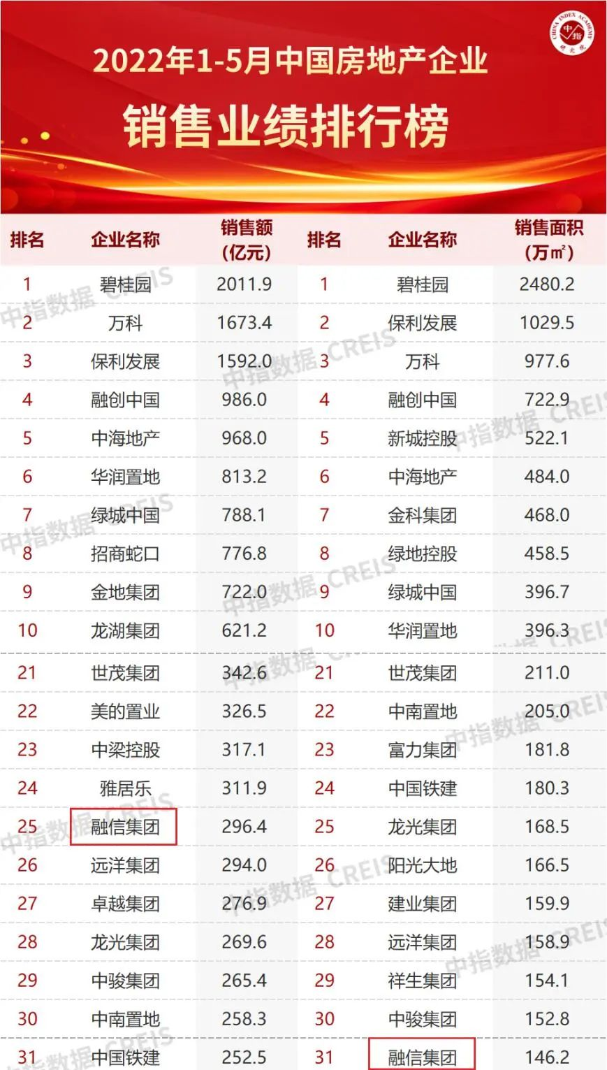 最新数据显示,在中指研究院公发布的《2022年1-5月中国房地产企业销售业绩TOP100排行榜》中,融信以296.4亿元的销售额位居TOP25,无疑昭示了融信强大的品牌实力与卓越的产品力,收获了市场的高度认可。