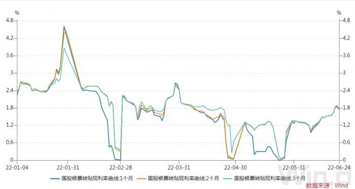 Wind数据显示,6月上旬也保持在1.3%左右,6月中下旬进一步回升,至6月23日,1个月、2个月、3个月期限的国股银票转贴现利率升至1.8%左右,创4月来的新高。